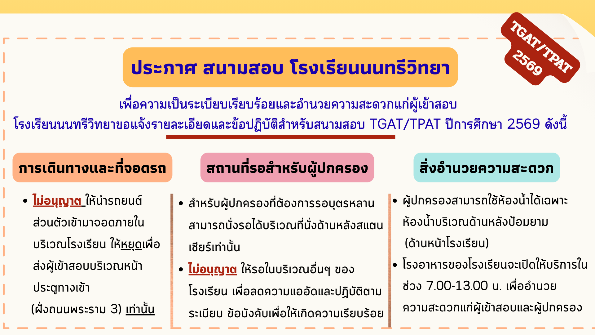 ประกาศ สนามสอบโรงเรียนนนทรีวิทยา เรื่อง รายละเอียดและข้อปฏิบัติสำหรับสนามสอบ TGAT/TPAT ปีการศึกษา 2569 ดังนี้