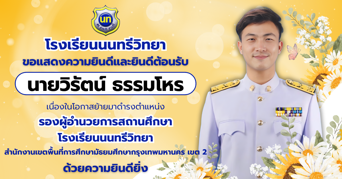 โรงเรียนนนทรีวิทยา ขอแสดงความยินดีและยินดีต้อนรับ นายวิรัตน์ ธรรมโหร เนื่องในโอกาสย้ายมาดำรงตำแหน่ง รองผู้อำนวยการสถานศึกษา โรงเรียนนนทรีวิทยา สำนักงานเขตพื้นที่การศึกษามัธยมศึกษากรุงเทพมหานคร เขต 2 ด้วยความยินดียิ่ง