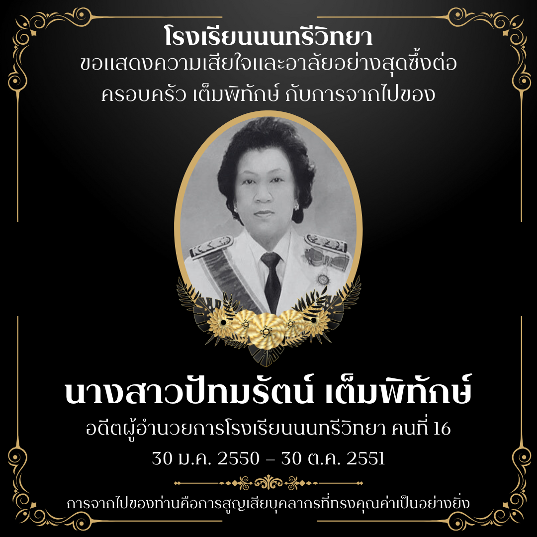 โรงเรียนนนทรีวิทยาขอแสดงความเสียใจและอาลัยอย่างสุดซึ้งต่อครอบครัว เต็มพิทักษ์ กับการจากไปของ นางสาวปัทมรัตน์ เต็มพิทักษ์ อดีตผู้อำนวยการโรงเรียนนนทรีวิทยา คนที่ 16 30 ม.ค. 2550 – 30 ต.ค. 2551 การจากไปของท่านคือการสูญเสียบุคลากรที่ทรงคุณค่าเป็นอย่างยิ่ง