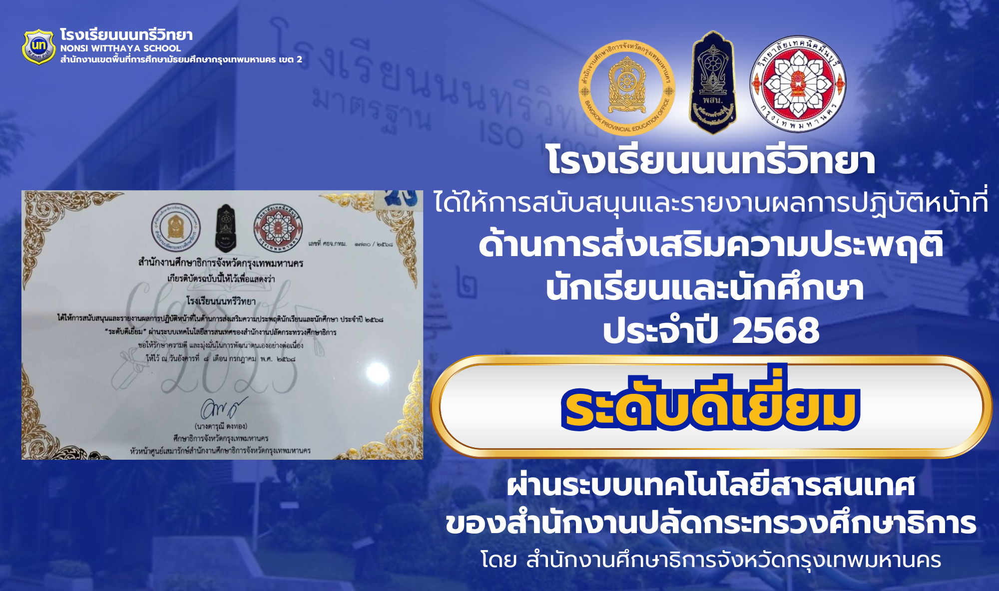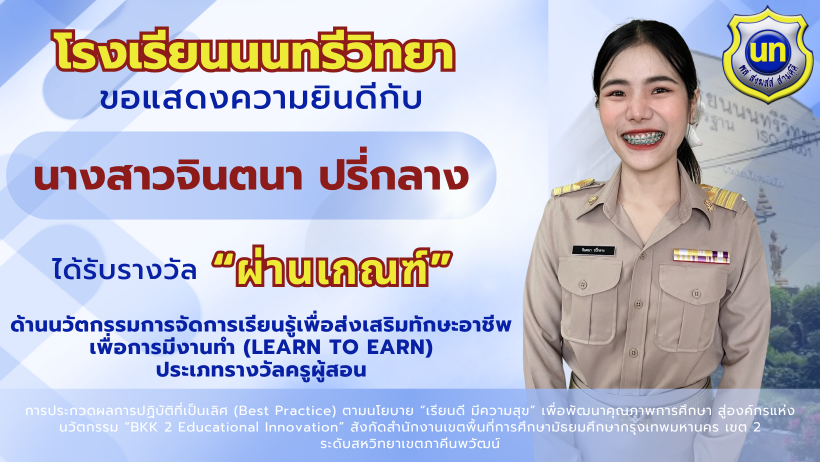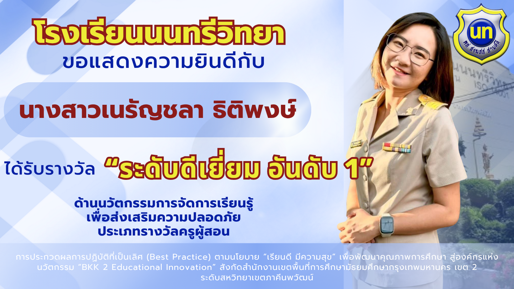 โรงเรียนนนทรีวิทยาขอแสดงความยินดีกับคุณครูที่ได้รับรางวัลนวัตกรรมสร้างสรรค์คนดี ระดับเขตพื้นที่การศึกษา ประจำปี 2568 ด้านการเรียนการสอนเพื่อส่งเสริมคุณธรรมจริยธรรม โดย สำนักงานเขตพื้นที่การศึกษามัธยมศึกษากรุงเทพมหานคร เขต 2 ให้ไว้ ณ วันที่ 25 สิงหาคม 2568
