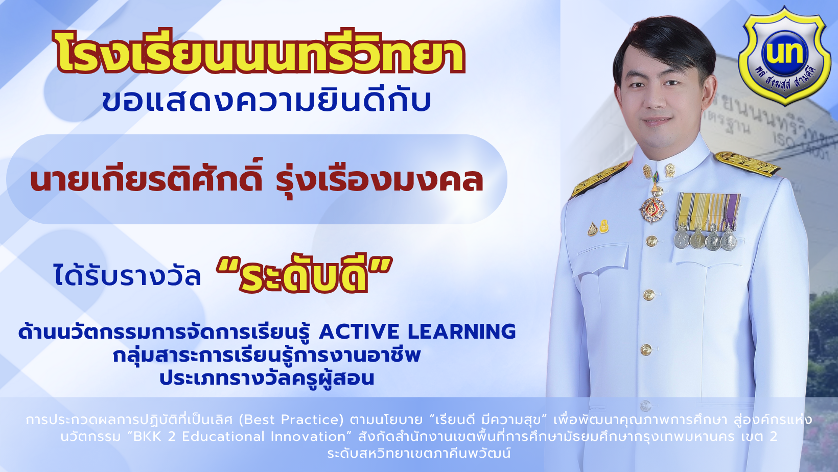 โรงเรียนนนทรีวิทยาขอแสดงความยินดีกับ นายสมชาย ย่างก้าวเจริญ ครูกลุ่มสาระการเรียนรู้ภาษาต่างประเทศ ได้รับรางวัลเชิดชูเกียรติพนักงานเจ้าหน้าที่ส่งเสริมความประพฤตินักเรียนและนักศึกษา กระทรวงศึกษาธิการ (รางวัลเสมาพิทักษ์) ระดับภาค ประจำปี พ.ศ. 2567