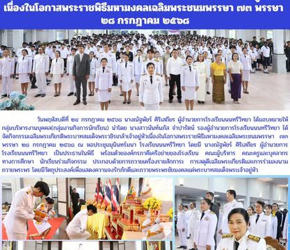 น้อมส่งเสด็จสู่สวรรคาลัย สมเด็จพระนางเจ้าสิริกิติ์ พระบรมราชินีนาถ พระบรมราชชนนีพันปีหลวง ข้าพระพุทธเจ้า คณะผู้บริหาร ครู บุคลากรทางการศึกษา ผู้ปกครอง และนักเรียน โรงเรียนนนทรีวิทยา