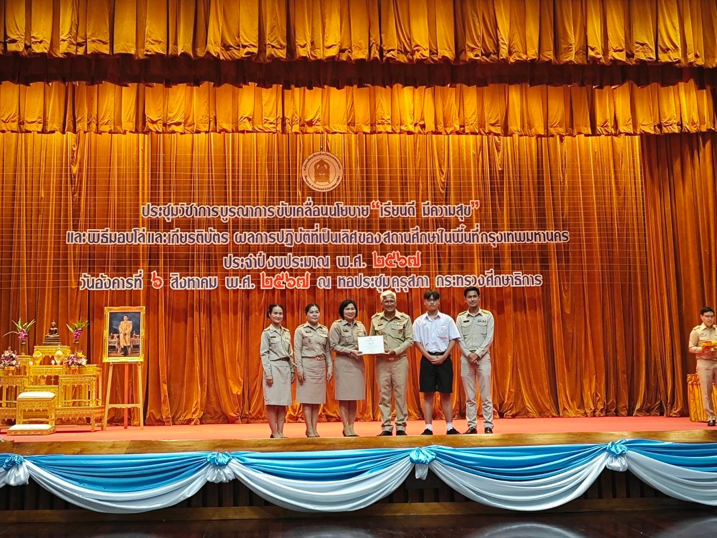 วันอังคารที่ 6 สิงหาคม พ.ศ. 2567 นางณัฐพัชร์ ศิริเสถียร ผู้อำนวยการโรงเรียนนนทรีวิทยา พร้อมด้วยคณะผู้บริหาร ครูและนักเรียน ร่วมพิธีรับรางวัลกิจกรรมประกวดสื่อวีดิทัศน์ “เยาวชนไทย ห่างไกลยาเสพติด” ปี พ.ศ. 2567 ตามโครงการส่งเสริมและสนับสนุนการป้องกันและแก้ไขปัญหายาเสพติด ในสถานศึกษา ณ หอประชุมคุรุสภา กระทรวงศึกษาธิการ โดยมี นายสุเทพ แก่งสันเทียะ ปลัดกระทรวงศึกษาธิการ เป็นประธานในพิธี โดยมีวัตถุประสงค์เพื่อส่งเสริมสนับสนุนให้เยาวชนตระหนักถึงภัยยาเสพติด และเพื่อป้องกันและแก้ไขปัญหายาเสพติดในสถานศึกษา