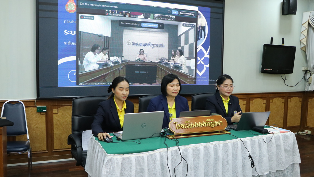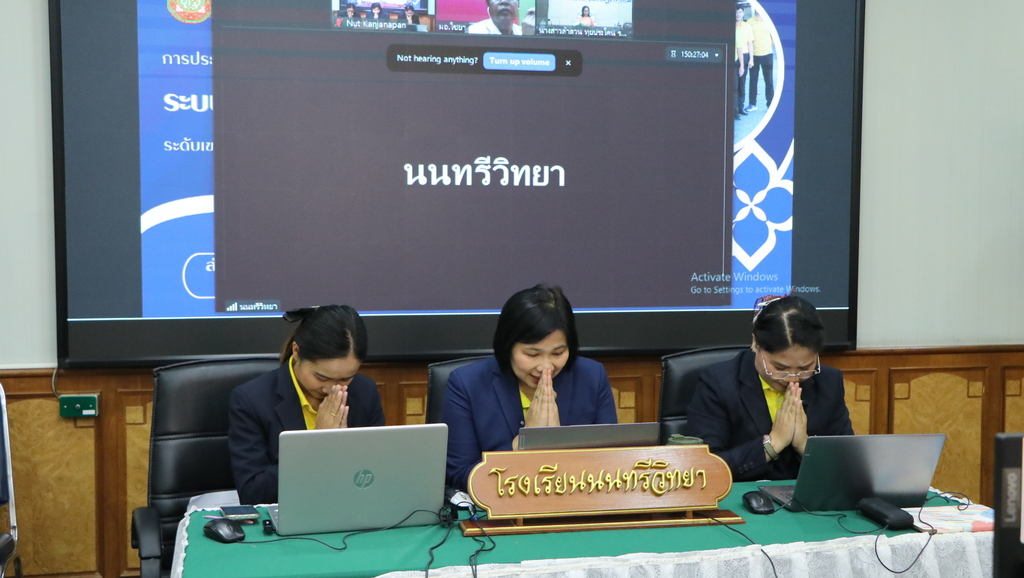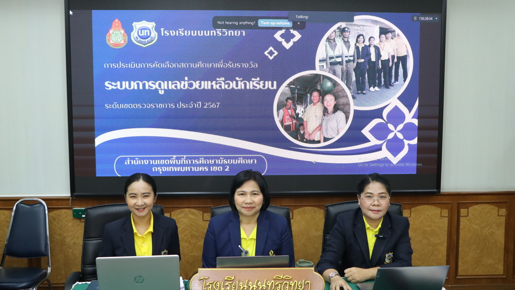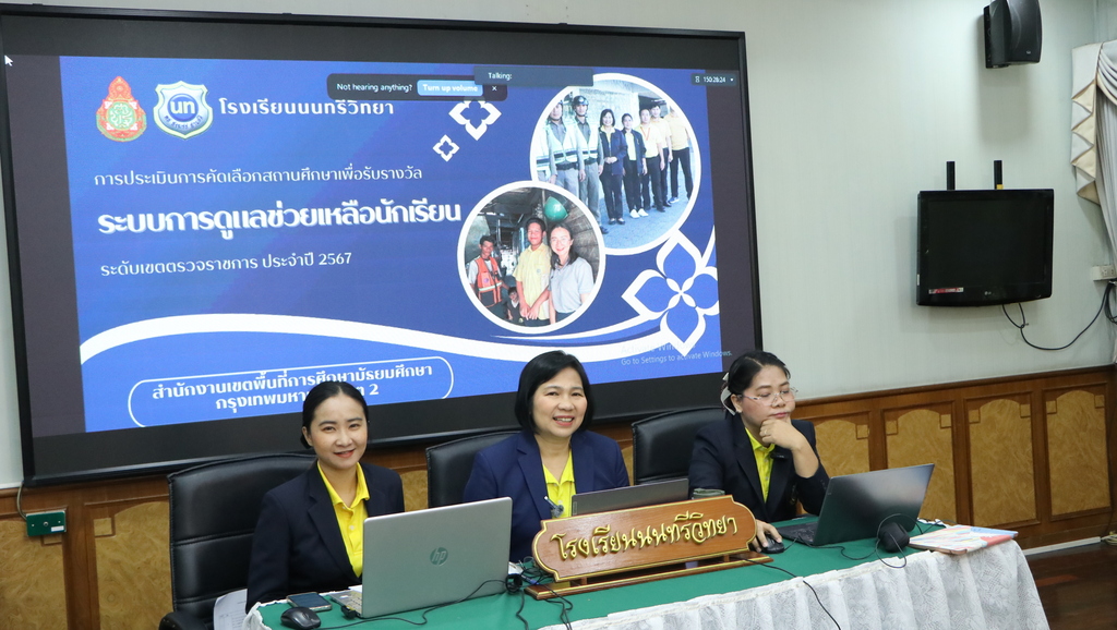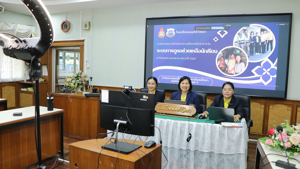 วันจันทร์ที่ 19 สิงหาคม พ.ศ.2567 นางณัฐพัชร์ ศิริเสถียร ผู้อำนวยการโรงเรียนนนทรีวิทยา พร้อมด้วย นางสาวนันท์นภัส จำปารัตน์ รองผู้อำนวยการโรงเรียนนนทรีวิทยา และนางสาวเนรัญชลา ธิติพงษ์ หัวหน้างานระบบการดูแลช่วยเหลือนักเรียน เข้ารับการประเมินเพื่อรับรางวัลระบบการดูแลช่วยเหลือนักเรียน ระดับเขตตรวจราชการ ประจำปี 2567 ประเภทสถานศึกษาระดับมัธยมศึกษาขนาดใหญ่ในรูปแบบออนไลน์