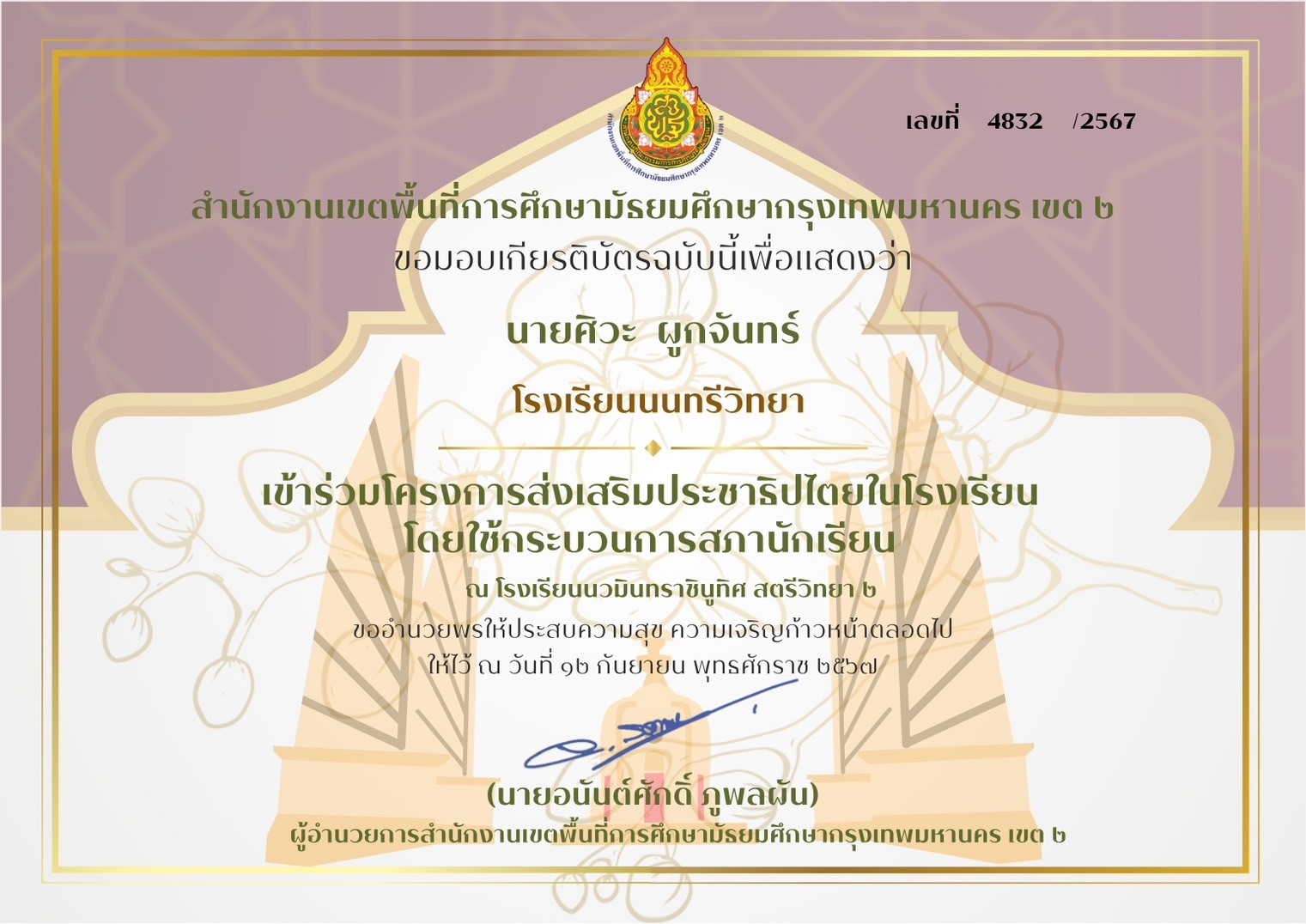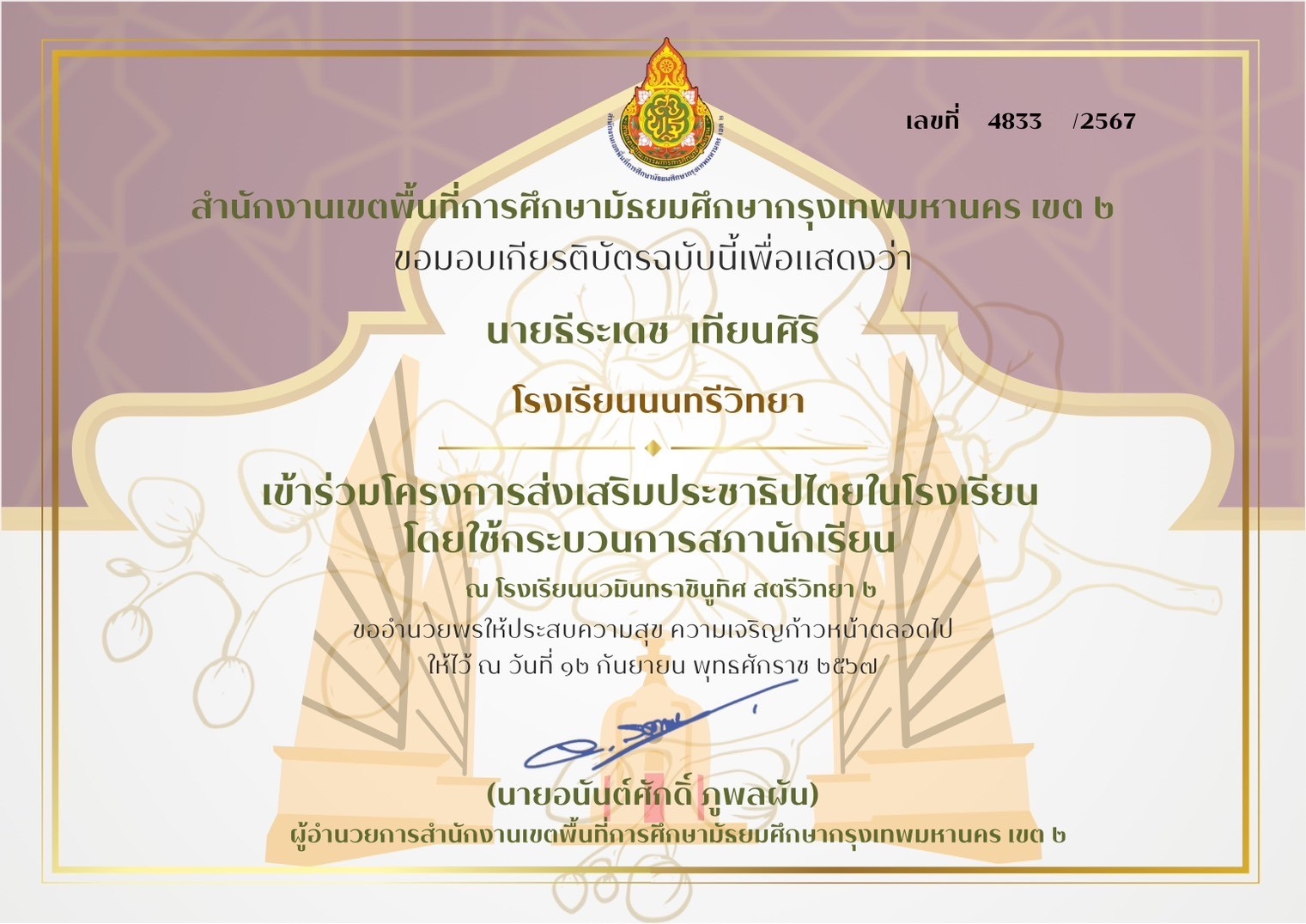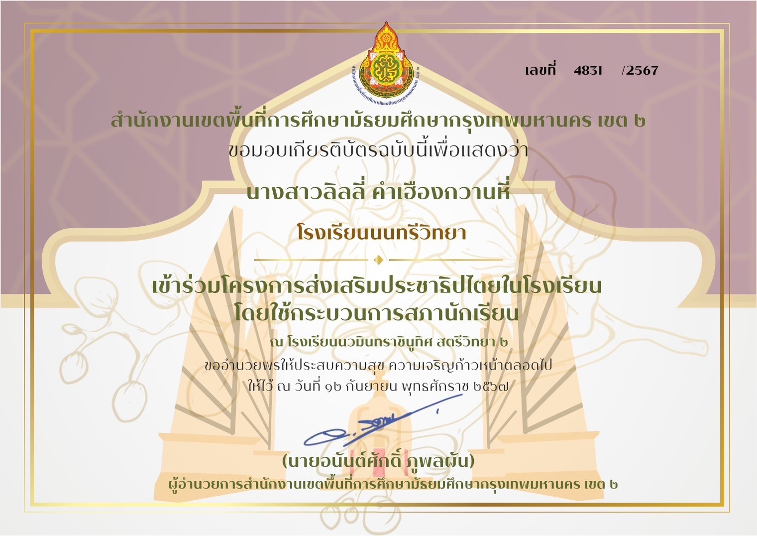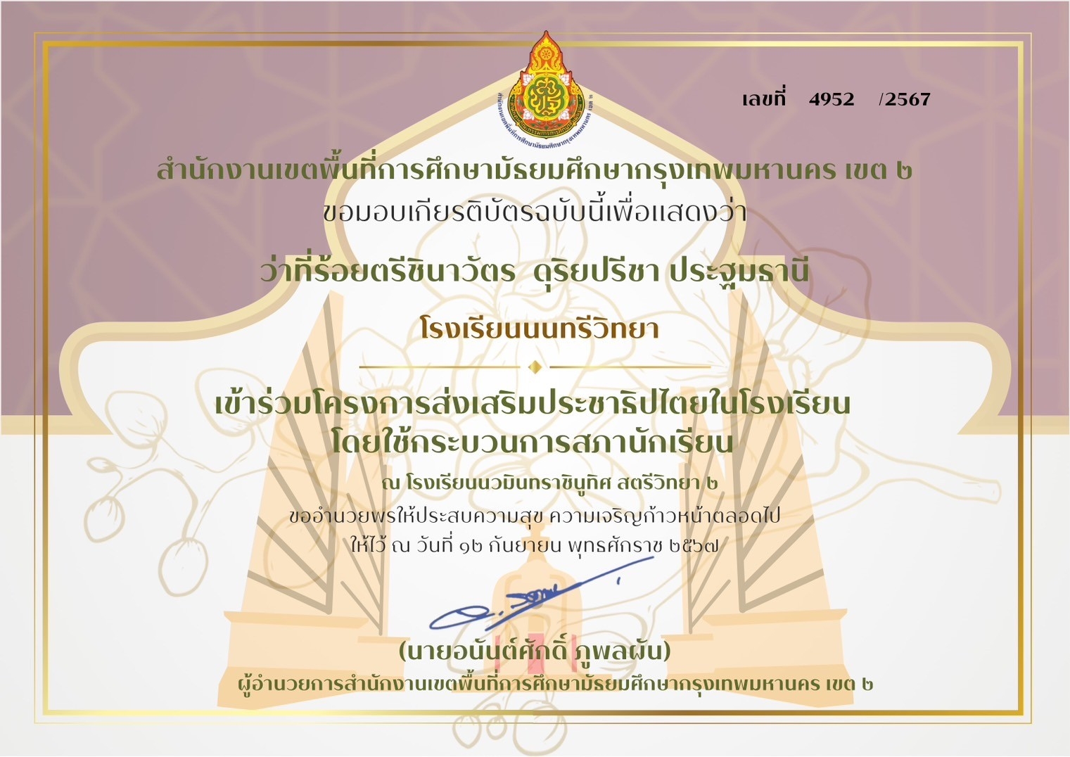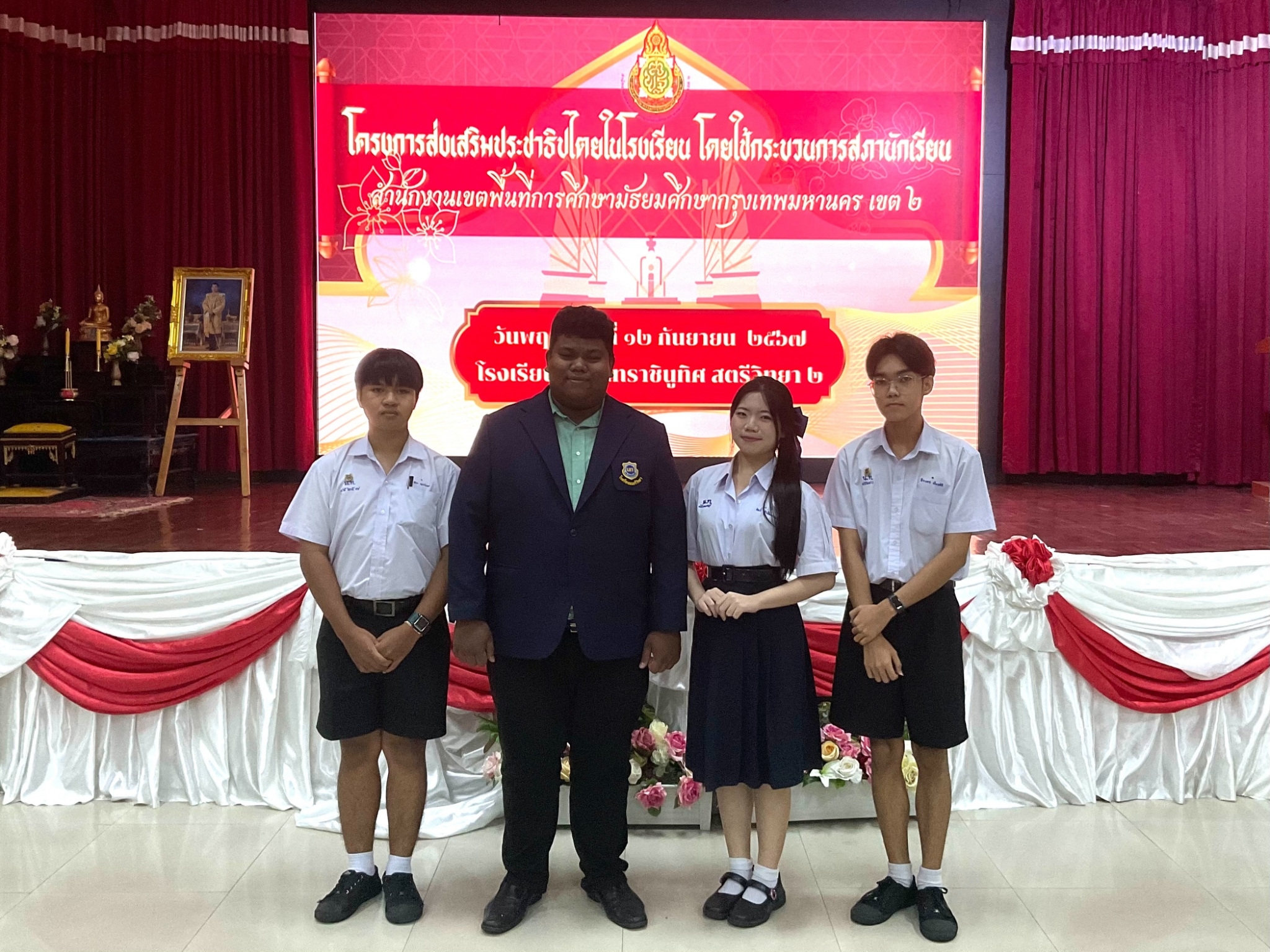 วันพฤหัสบดีที่ 12 กันยายน พ.ศ. 2567 นางณัฐพัชร์ ศิริเสถียร ผู้อำนวยการโรงเรียนนนทรีวิทยา ได้มอบหมายให้กลุ่มบริหารงานบุคคล(กลุ่มงานกิจการนักเรียน) นำโดย นางสาวนันท์นภัส จำปารัตน์ รองผู้อำนวยการโรงเรียนนนทรีวิทยา นำคณะกรรมการสภานักเรียน ประจำปี 2567 เข้าร่วมโครงการส่งเสริมประชาธิปไตยในโรงเรียนโดยใช้กระบวนการสภานักเรียน ณ โรงเรียนนวมินทราชินูทิศ สตรีวิทยา 2 โดยมี ว่าที่ร้อยตรีชินาวัตร ดุริยปรีชา ประฐมธานี เป็นครูดูแลนักเรียนในการเข้าร่วมกิจกรรม มีวัตถุประสงค์เพื่อให้นักเรียนเข้าใจบทบาทหน้าที่ของสภานักเรียน เป็นคนดี มีวินัย มีความจงรักภักดีต่อสถาบันหลักของชาติ มีทัศนคติที่ถูกต้องต่อบ้านเมือง มีคุณธรรม จริยธรรม พัฒนาชีวิตและสังคมอย่างสร้างสรรค์