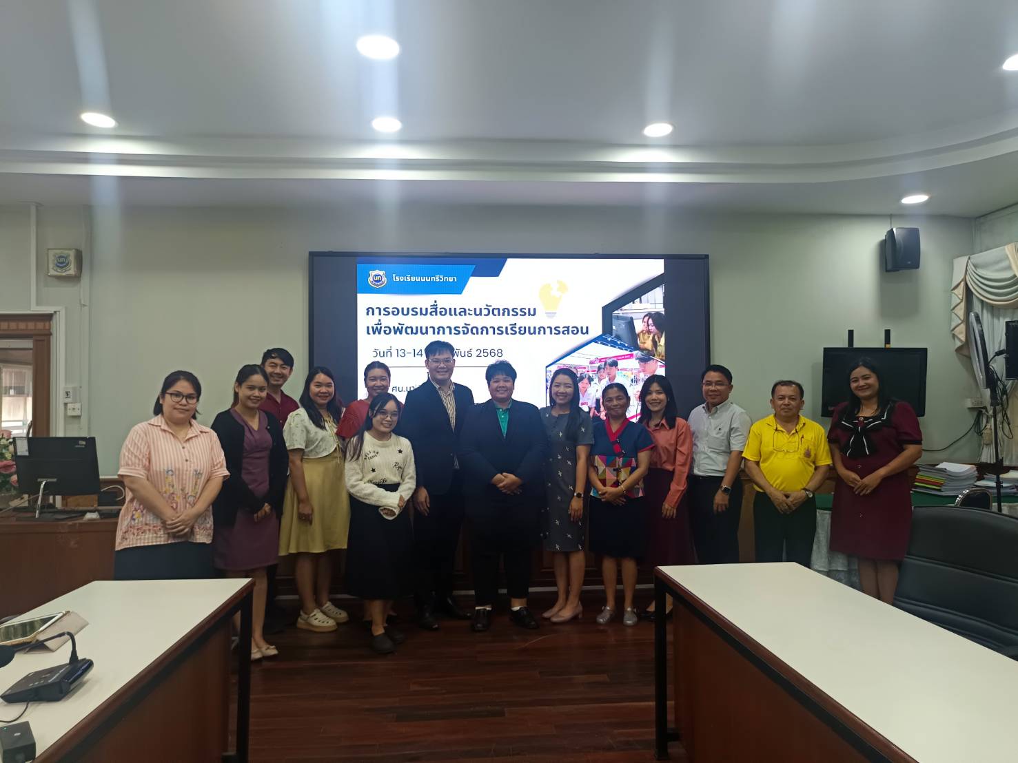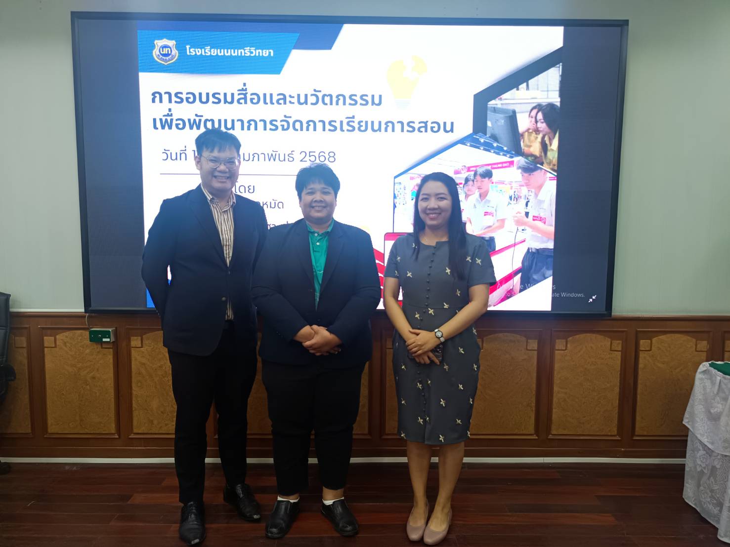 วันที่ 13-14 กุมภาพันธ์ 2568 นางณัฐพัชร์ ศิริเสถียร ผู้อำนวยการโรงเรียนนนทรีวิทยา มอบหมายให้ นางธิดา หวังสุข รองผู้อำนวยการกลุ่มบริหารวิชาการ และคณะกรรมการกลุ่มบริหารวิชาการ ได้ให้การต้อนรับ นางสาวขนิษฐา พุ่มสงวน ศึกษานิเทศก์ชำนาญการ และ นายศุภ์ชล กีรติสุนทร ศึกษานิเทศก์ชำนาญการ จากสำนักงานเขตพื้นที่การศึกษามัธยมศึกษากรุงเทพมหานคร เขต 2 ที่ได้รับเชิญเป็นวิทยากรให้ความรู้ในหัวข้อ “การอบรมสื่อและนวัตกรรมเพื่อพัฒนาการจัดการเรียนการสอน” ณ ห้องประชุมอดิสร ใสสุก โรงเรียนนนทรีวิทยา โดยมีวัตถุประสงค์เพื่อส่งเสริมให้ครูผลิตสื่อและนวัตกรรมในการจัดการเรียนการสอนที่มีประสิทธิภาพมากยิ่งขึ้น