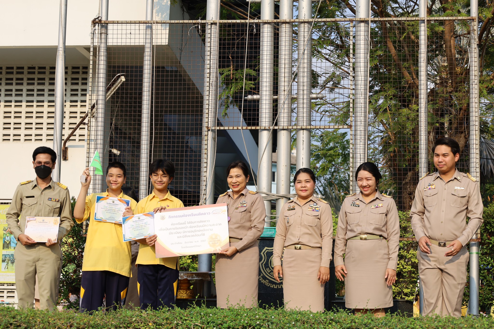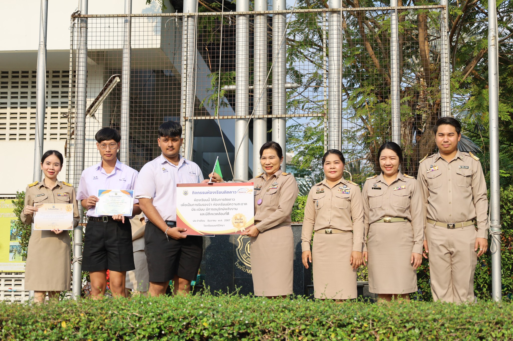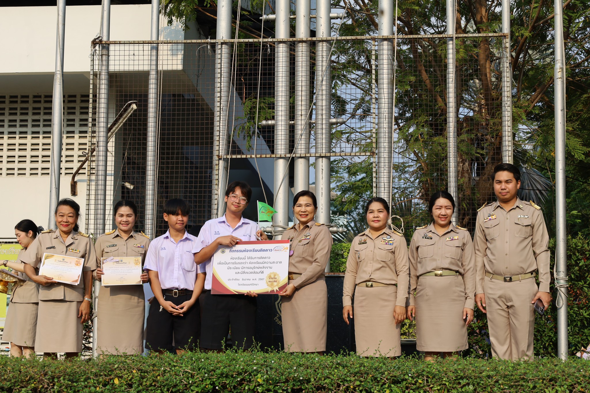 วันจันทร์ที่ 17 กุมภาพันธ์ 2568 นางณัฐพัชร์ ศิริเสถียร ผู้อำนวยการโรงเรียนนนทรีวิทยา ได้มอบหมายให้กลุ่มบริหารทั่วไป นำโดย นายสิริพัฒน์ ทีฆะสุข รองผู้อำนวยการโรงเรียนนนทรีวิทยา จัดพิธีการมอบเกียรติบัตรให้กับห้องเรียนที่ได้รับรางวัลการตรวจประเมินด้านความสะอาด ความเป็นระเบียบ “ห้องเรียนติดดาว” ณ บริเวณหน้าเสาธง โรงเรียนนนทรีวิทยา โดยมี นางณัฐพัชร์ ศิริเสถียร ผู้อำนวยการโรงเรียนนนทรีวิทยา เป็นประธานในการมอบเกียรติบัตรพร้อมด้วยคณะผู้บริหาร ซึ่งงานอนุรักษ์พลังงานและสิ่งแวดล้อม กลุ่มบริหารทั่วไป ได้จัดกิจกรรมประกวดห้องเรียน เพื่อพัฒนาคุณภาพห้องเรียนในด้านความสะอาด ความเป็นระเบียบ และให้นักเรียนรู้จักการอนุรักษ์พลังงานและสิ่งแวดล้อม สร้างสภาพบรรยากาศสิ่งแวดล้อมที่ดีในการเรียน