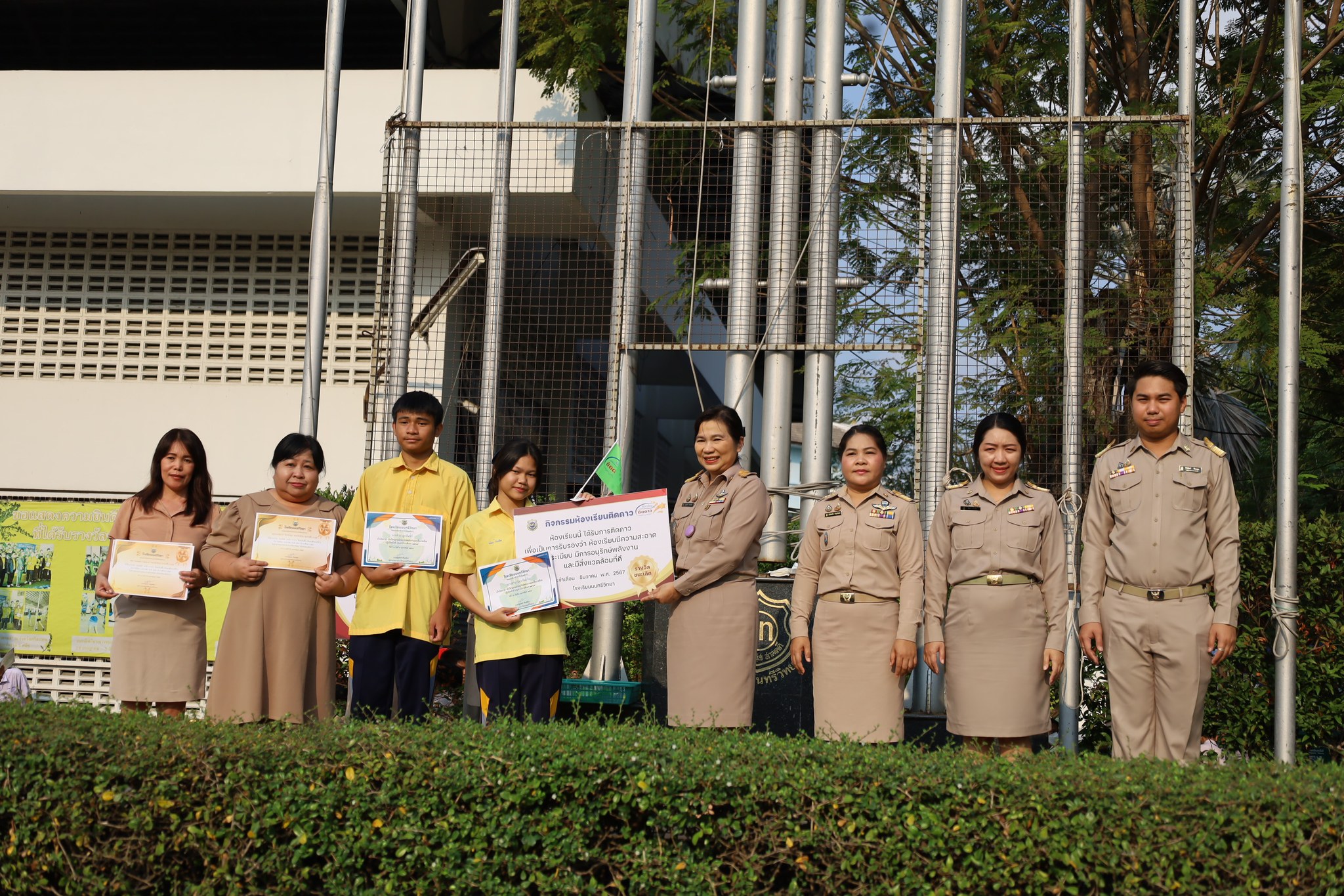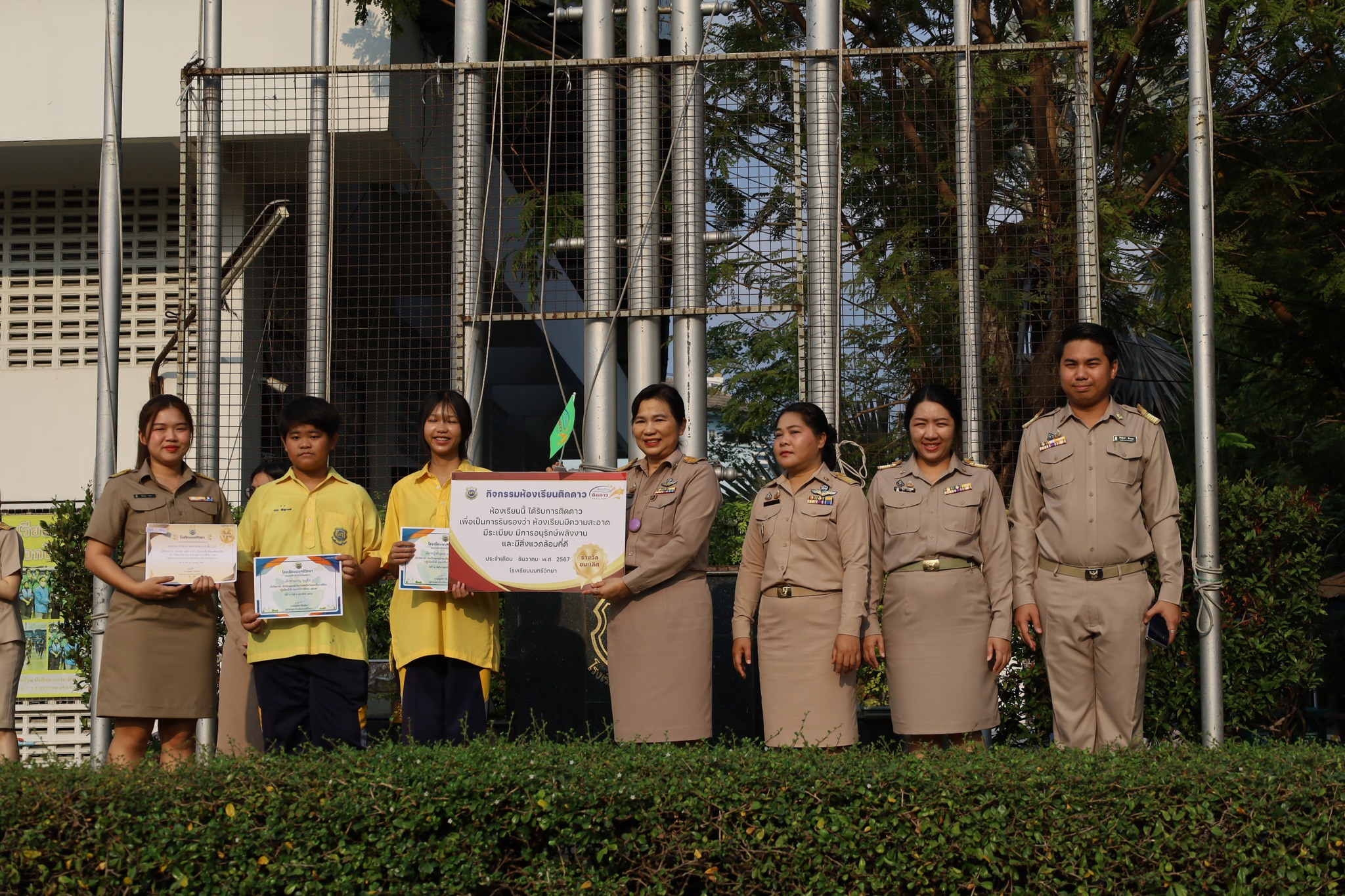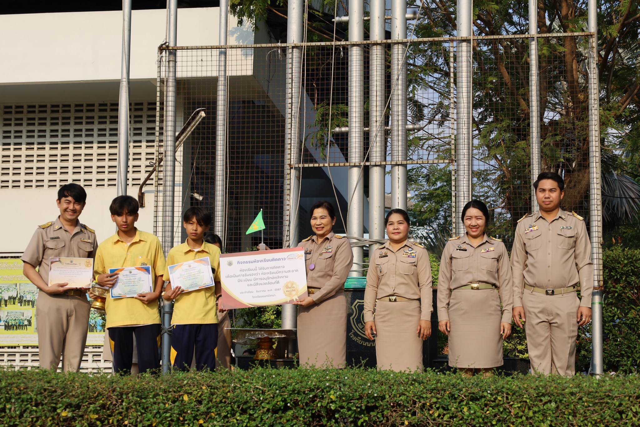 วันจันทร์ที่ 17 กุมภาพันธ์ 2568 นางณัฐพัชร์ ศิริเสถียร ผู้อำนวยการโรงเรียนนนทรีวิทยา ได้มอบหมายให้กลุ่มบริหารทั่วไป นำโดย นายสิริพัฒน์ ทีฆะสุข รองผู้อำนวยการโรงเรียนนนทรีวิทยา จัดพิธีการมอบเกียรติบัตรให้กับห้องเรียนที่ได้รับรางวัลการตรวจประเมินด้านความสะอาด ความเป็นระเบียบ “ห้องเรียนติดดาว” ณ บริเวณหน้าเสาธง โรงเรียนนนทรีวิทยา โดยมี นางณัฐพัชร์ ศิริเสถียร ผู้อำนวยการโรงเรียนนนทรีวิทยา เป็นประธานในการมอบเกียรติบัตรพร้อมด้วยคณะผู้บริหาร ซึ่งงานอนุรักษ์พลังงานและสิ่งแวดล้อม กลุ่มบริหารทั่วไป ได้จัดกิจกรรมประกวดห้องเรียน เพื่อพัฒนาคุณภาพห้องเรียนในด้านความสะอาด ความเป็นระเบียบ และให้นักเรียนรู้จักการอนุรักษ์พลังงานและสิ่งแวดล้อม สร้างสภาพบรรยากาศสิ่งแวดล้อมที่ดีในการเรียน