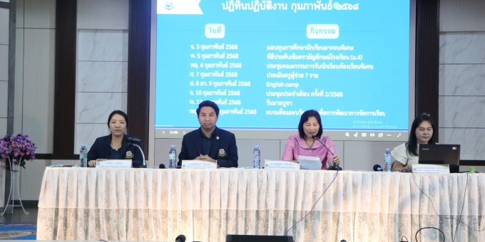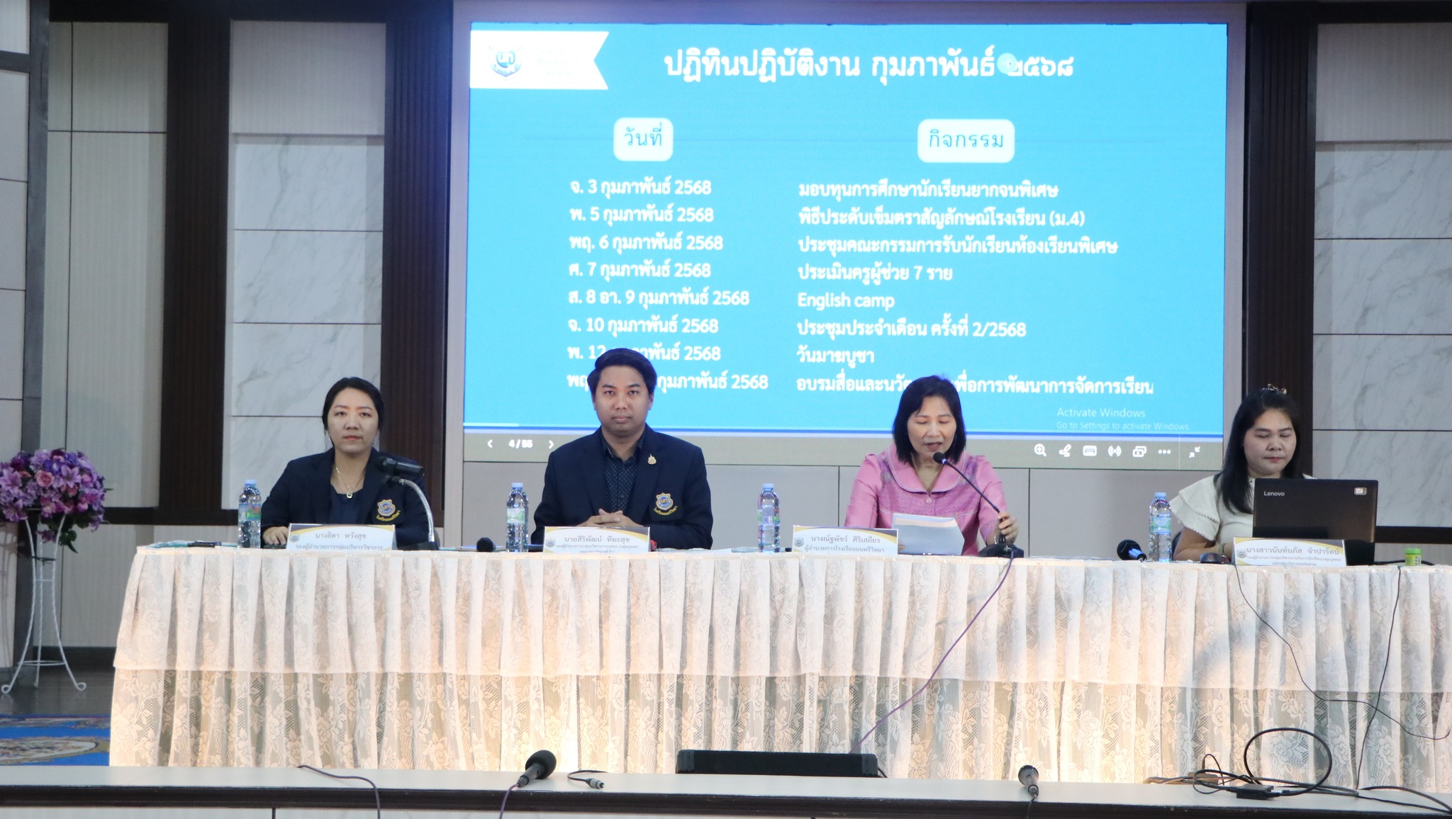 วันพฤหัสบดีที่ 13 มีนาคม 2568 นางณัฐพัชร์ ศิริเสถียร ผู้อำนวยการโรงเรียนนนทรีวิทยา เป็นประธานการประชุมครู ครั้งที่ 3 ประจำปี 2568 พร้อมด้วยคณะผู้บริหาร ณ หอประชุมมุนินทร์มนา โรงเรียนนนทรีวิทยา เพื่อชี้แจงผลการปฏิบัติงานและความคืบหน้าการปฏิบัติงานที่ผ่านมา ปฏิทินการปฏิบัติงาน แนวทางการปฏิบัติงาน และข้อราชการต่าง ๆ ให้แก่คณะครูและบุคลากรทางการศึกษา ได้รับฟังร่วมกัน สร้างความเข้าใจในการปฏิบัติงานร่วมกัน ส่งผลให้เกิดการทำงานที่มีประสิทธิภาพ