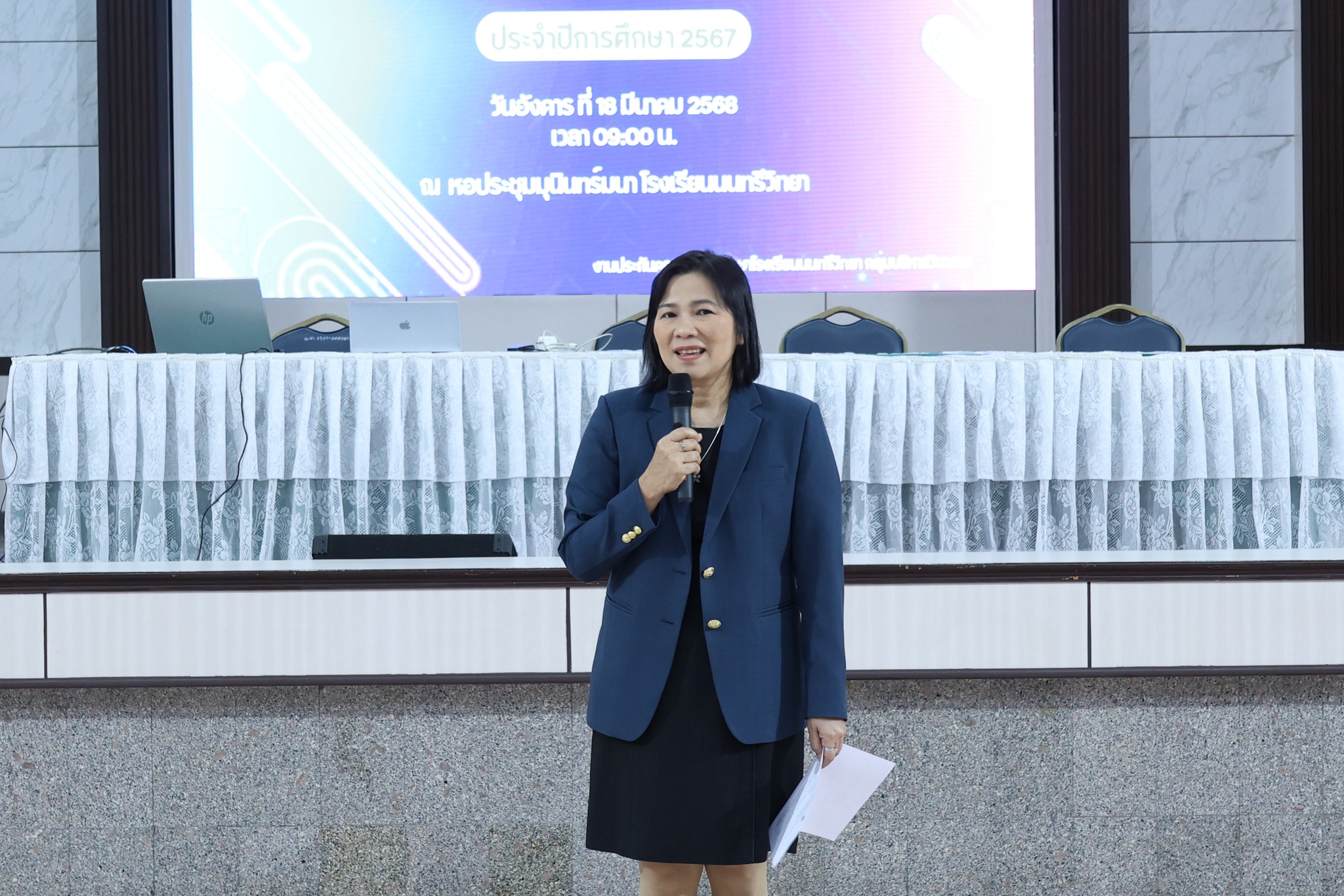 วันอังคารที่ 18 มีนาคม 2568 นางณัฐพัชร์ ศิริเสถียร ผู้อำนวยการโรงเรียนนนทรีวิทยา ได้มอบหมายให้กลุ่มบริหารวิชาการ นำโดย นางธิดา หวังสุข รองผู้อำนวยการโรงเรียนนนทรีวิทยา จัดการประชุมเชิงปฏิบัติการการประกันคุณภาพภายในสถานศึกษา ปีการศึกษา 2567 ณ หอประชุมมุนินทร์มนา โรงเรียนนนทรีวิทยา โดยมี นางสาวเมธาวี นิเลิศรัมย์ หัวหน้างานประกันคุณภาพการศึกษา ดำเนินการชี้แจงแนวปฏิบัติการประเมินคุณภาพการศึกษา กิจกรรมนี้มีวัตถุประสงค์เพื่อให้การดำเนินงานเป็นไปด้วยความเรียบร้อย ถูกต้อง เหมาะสม โดยคำนึงถึงบริบท ความพร้อมของครูและบุคลการทางการศึกษาภายในสถานศึกษาเพื่อรับการประเมินจากคณะกรรมการ