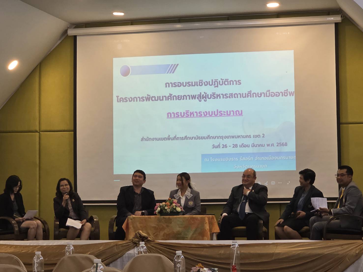 วันที่ 26-28 มีนาคม 2568 นางณัฐพัชร์ ศิริเสถียร ผู้อำนวยการโรงเรียนนนทรีวิทยา พร้อมด้วย นางธิดา หวังสุข และ นายสิริพัฒน์ ทีฆะสุข รองผู้อำนวยการโรงเรียนนนทรีวิทยา เข้าร่วมการอบรมเชิงปฏิบัติการ โครงการพัฒนาศักยภาพสู่ผู้บริหารสถานศึกษามืออาชีพ สํานักงานเขตพื้นที่การศึกษามัธยมศึกษากรุงเทพมหานคร เขต 2 และการประเมินสัมฤทธิผลการปฏิบัติงานในหน้าที่ตําแหน่งผู้อํานวยการสถานศึกษาและตําแหน่งรองผู้อํานวยการสถานศึกษา เพื่อพัฒนาการศึกษาระยะเวลา 1 ปีและรอบ 6 เดือน ณ โรงแรมอิงธาร รีสอร์ท อําเภอเมืองนครนายก จังหวัดนครนายก