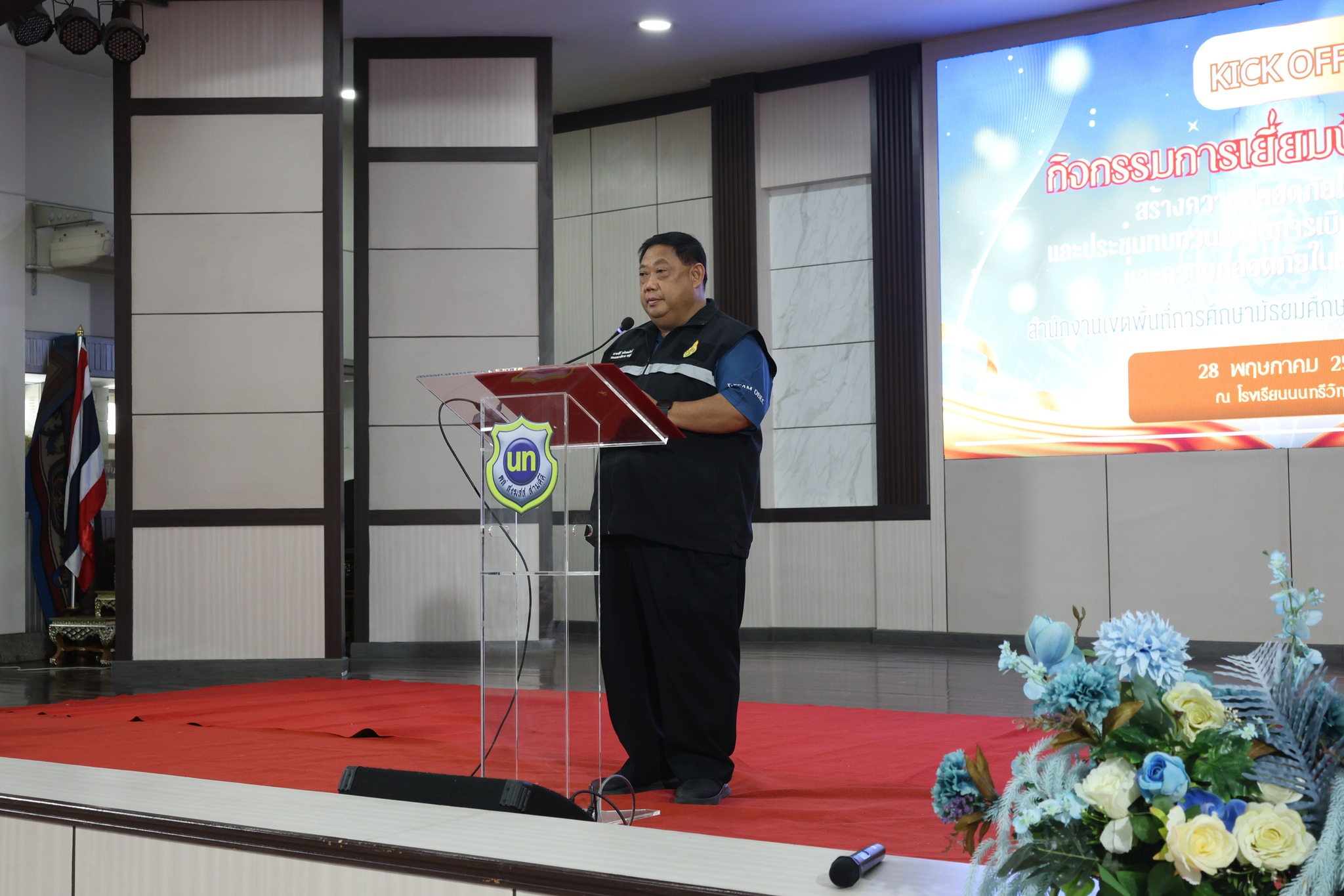 วันพุธที่ 28 พฤษภาคม 2568 นางณัฐพัชร์ ศิริเสถียร ผู้อำนวยการโรงเรียนนนทรีวิทยา พร้อมด้วยคณะผู้บริหารและคณะครู ได้ให้การต้อนรับ ดร.ธีร์ ภวังคนันท์ รองเลขาธิการคณะกรรมการการศึกษาขั้นพื้นฐาน ที่ให้เกียรติเป็นประธานในพิธีเปิด Kick Off มิถุนายน เดือนแห่งการเยี่ยมบ้าน สพม.กท 2 “สร้างความปลอดภัยไปด้วยกัน” และได้ร่วมบรรยายพิเศษในประเด็นนโยบายด้านการเสริมสร้างความปลอดภัยของสถานศึกษา ระบบการดูแลช่วยเหลือนักเรียน รวมไปถึงมาตรการป้องกันและแก้ไขปัญหาบุหรี่ไฟฟ้าและยาเสพติดในสถานศึกษา ณ หอประชุมมุนินทร์มนา โรงเรียนนนทรีวิทยา พร้อมด้วย ดร.อุดม พรมพันธ์ใจ ผู้แทนรัฐมนตรีว่าการกระทรวงศึกษาธิการ ดร.นภาพร พงษ์ขัน ผู้อำนวยการสำนักงานเขตพื้นที่การศึกษามัธยมศึกษากรุงเทพมหานคร เขต 2 และคณะผู้บริหารสำนักงานเขตพื้นที่ การศึกษามัธยมศึกษากรุงเทพมหานคร เขต 2 พร้อมนำคณะผู้บริหารสถานศึกษาในสังกัดร่วมขบวนปล่อยแถว Kick Off การเยี่ยมบ้านนักเรียน “สร้างความปลอดภัยไปด้วยกัน” เพื่อสร้างโอกาสในการเรียนรู้ สร้างภูมิคุ้มกัน เพื่อความสุข และความปลอดภัยของนักเรียนตามนโยบาย “เรียนดี มีความสุข” ของรัฐมนตรีว่าการกระทรวงศึกษาธิการ