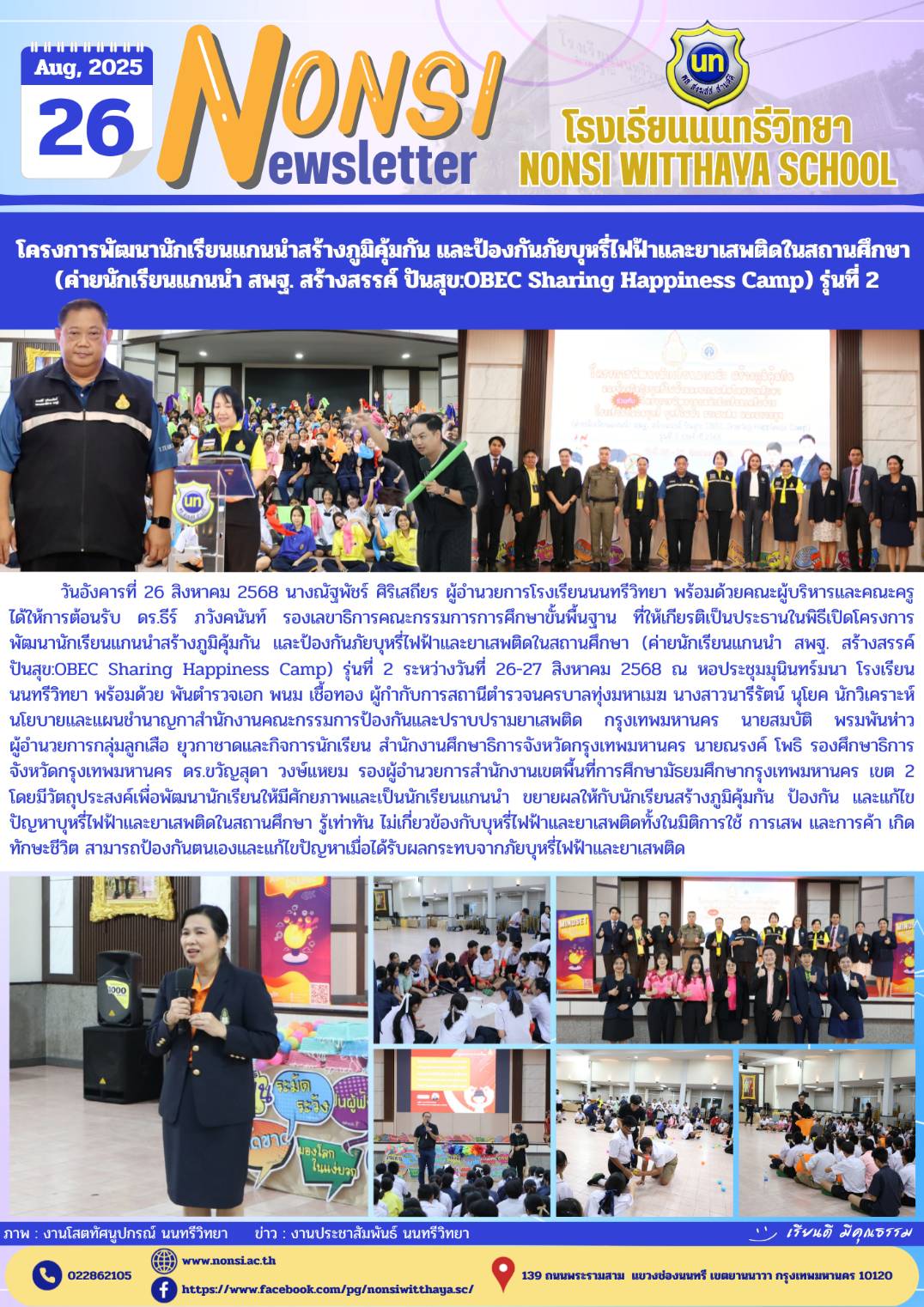 วันอังคารที่ 26 สิงหาคม 2568 นางณัฐพัชร์ ศิริเสถียร ผู้อำนวยการโรงเรียนนนทรีวิทยา พร้อมด้วยคณะผู้บริหารและคณะครู ได้ให้การต้อนรับ ดร.ธีร์ ภวังคนันท์ รองเลขาธิการคณะกรรมการการศึกษาขั้นพื้นฐาน ที่ให้เกียรติเป็นประธานในพิธีเปิดโครงการพัฒนานักเรียนแกนนำสร้างภูมิคุ้มกัน และป้องกันภัยบุหรี่ไฟฟ้าและยาเสพติดในสถานศึกษา (ค่ายนักเรียนแกนนำ สพฐ. สร้างสรรค์ ปันสุข:OBEC Sharing Happiness Camp) รุ่นที่ 2 ระหว่างวันที่ 26-27 สิงหาคม 2568 ณ หอประชุมมุนินทร์มนา โรงเรียนนนทรีวิทยา พร้อมด้วย พันตำรวจเอก พนม เชื้อทอง ผู้กำกับการสถานีตำรวจนครบาลทุ่งมหาเมฆ นางสาวนารีรัตน์ นุโยค นักวิเคราะห์นโยบายและแผนชำนาญกาสำนักงานคณะกรรมการป้องกันและปราบปรามยาเสพติด กรุงเทพมหานคร นายสมบัติ พรมพันห่าว ผู้อํานวยการกลุ่มลูกเสือ ยุวกาชาดและกิจการนักเรียน สำนักงานศึกษาธิการจังหวัดกรุงเทพมหานคร นายณรงค์ โพธิ รองศึกษาธิการจังหวัดกรุงเทพมหานคร ดร.ขวัญสุดา วงษ์แหยม รองผู้อำนวยการสำนักงานเขตพื้นที่การศึกษามัธยมศึกษากรุงเทพมหานคร เขต 2 โดยมีวัตถุประสงค์เพื่อพัฒนานักเรียนให้มีศักยภาพและเป็นนักเรียนแกนนำ ขยายผลให้กับนักเรียนสร้างภูมิคุ้มกัน ป้องกัน และแก้ไขปัญหาบุหรี่ไฟฟ้าและยาเสพติดในสถานศึกษา รู้เท่าทัน ไม่เกี่ยวข้องกับบุหรี่ไฟฟ้าและยาเสพติดทั้งในมิติการใช้ การเสพ และการค้า เกิดทักษะชีวิต สามารถป้องกันตนเองและแก้ไขปัญหาเมื่อได้รับผลกระทบจากภัยบุหรี่ไฟฟ้าและยาเสพติด