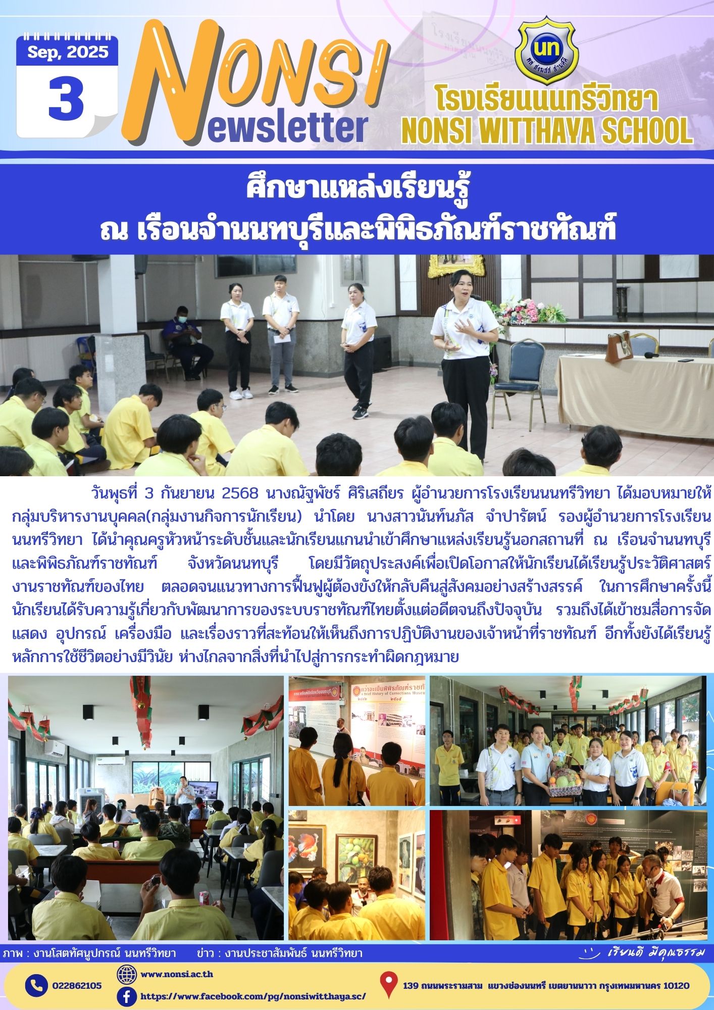 วันพุธที่ 3 กันยายน 2568 นางณัฐพัชร์ ศิริเสถียร ผู้อำนวยการโรงเรียนนนทรีวิทยา ได้มอบหมายให้กลุ่มบริหารงานบุคคล(กลุ่มงานกิจการนักเรียน) นำโดย นางสาวนันท์นภัส จำปารัตน์ รองผู้อำนวยการโรงเรียนนนทรีวิทยา ได้นำคุณครูหัวหน้าระดับชั้นและนักเรียนแกนนำเข้าศึกษาแหล่งเรียนรู้นอกสถานที่ ณ เรือนจำนนทบุรี และพิพิธภัณฑ์ราชทัณฑ์ จังหวัดนนทบุรี โดยมีวัตถุประสงค์เพื่อเปิดโอกาสให้นักเรียนได้เรียนรู้ประวัติศาสตร์งานราชทัณฑ์ของไทย ตลอดจนแนวทางการฟื้นฟูผู้ต้องขังให้กลับคืนสู่สังคมอย่างสร้างสรรค์ ในการศึกษาครั้งนี้ นักเรียนได้รับความรู้เกี่ยวกับพัฒนาการของระบบราชทัณฑ์ไทยตั้งแต่อดีตจนถึงปัจจุบัน รวมถึงได้เข้าชมสื่อการจัดแสดง อุปกรณ์ เครื่องมือ และเรื่องราวที่สะท้อนให้เห็นถึงการปฏิบัติงานของเจ้าหน้าที่ราชทัณฑ์ อีกทั้งยังได้เรียนรู้หลักการใช้ชีวิตอย่างมีวินัย ห่างไกลจากสิ่งที่นำไปสู่การกระทำผิดกฎหมาย