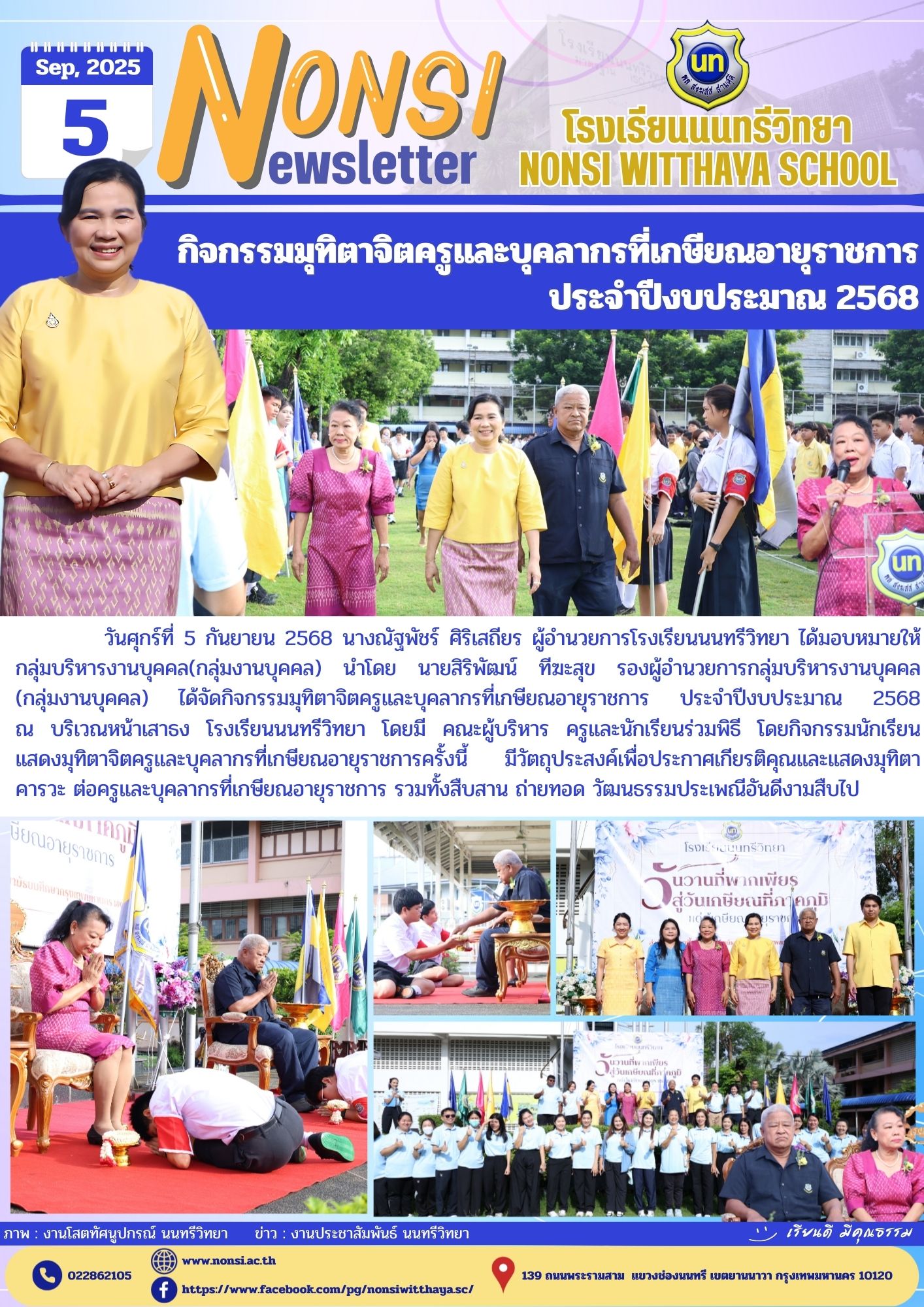 วันศุกร์ที่ 5 กันยายน 2568 นางณัฐพัชร์ ศิริเสถียร ผู้อำนวยการโรงเรียนนนทรีวิทยา ได้มอบหมายให้ กลุ่มบริหารงานบุคคล(กลุ่มงานบุคคล) นำโดย นายสิริพัฒน์ ทีฆะสุข รองผู้อำนวยการกลุ่มบริหารงานบุคคล (กลุ่มงานบุคคล) ได้จัดกิจกรรมมุทิตาจิตครูและบุคลากรที่เกษียณอายุราชการ ประจำปีงบประมาณ 2568 ณ บริเวณหน้าเสาธง โรงเรียนนนทรีวิทยา โดยมี คณะผู้บริหาร ครูและนักเรียนร่วมพิธี โดยกิจกรรมนักเรียนแสดงมุทิตาจิตครูและบุคลากรที่เกษียณอายุราชการครั้งนี้ มีวัตถุประสงค์เพื่อประกาศเกียรติคุณและแสดงมุทิตาคารวะ ต่อครูและบุคลากรที่เกษียณอายุราชการ รวมทั้งสืบสาน ถ่ายทอด วัฒนธรรมประเพณีอันดีงามสืบไป