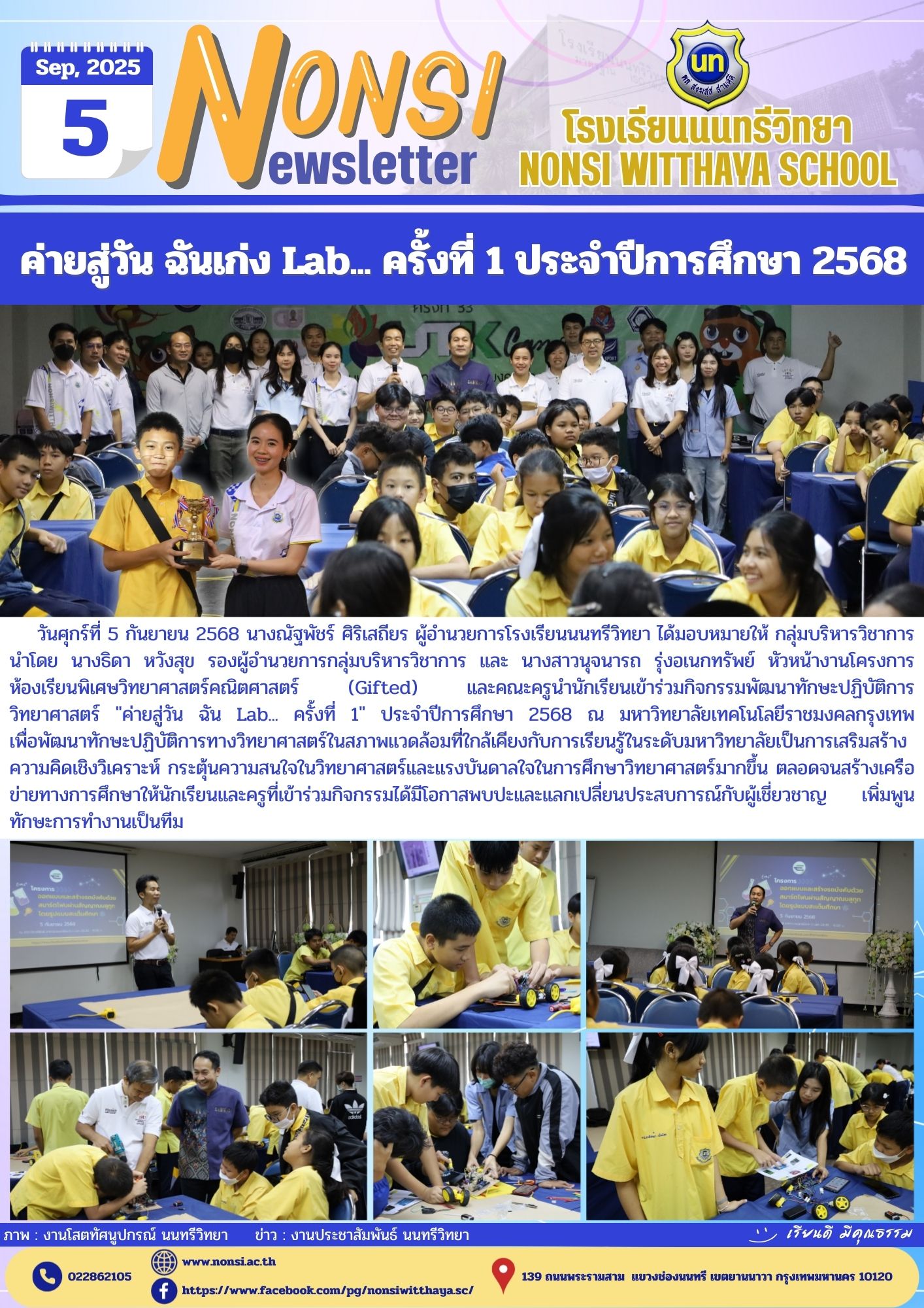 วันศุกร์ที่ 5 กันยายน 2568 นางณัฐพัชร์ ศิริเสถียร ผู้อำนวยการโรงเรียนนนทรีวิทยา ได้มอบหมายให้ กลุ่มบริหารวิชาการ นำโดย นางธิดา หวังสุข รองผู้อำนวยการกลุ่มบริหารวิชาการ และ นางสาวนุจนารถ รุ่งอเนกทรัพย์ หัวหน้างานโครงการห้องเรียนพิเศษวิทยาศาสตร์คณิตศาสตร์ (Gifted) และคณะครูนำนักเรียนเข้าร่วมกิจกรรมพัฒนาทักษะปฏิบัติการวิทยาศาสตร์ “ค่ายสู่วัน ฉันเก่ง Lab… ครั้งที่ 1” ประจำปีการศึกษา 2568 ณ มหาวิทยาลัยเทคโนโลยีราชมงคลกรุงเทพ เพื่อพัฒนาทักษะปฏิบัติการทางวิทยาศาสตร์ในสภาพแวดล้อมที่ใกล้เคียงกับการเรียนรู้ในระดับมหาวิทยาลัยเป็นการเสริมสร้างความคิดเชิงวิเคราะห์ กระตุ้นความสนใจในวิทยาศาสตร์และแรงบันดาลใจในการศึกษาวิทยาศาสตร์มากขึ้น ตลอดจนสร้างเครือข่ายทางการศึกษาให้นักเรียนและครูที่เข้าร่วมกิจกรรมได้มีโอกาสพบปะและแลกเปลี่ยนประสบการณ์กับผู้เชี่ยวชาญ เพิ่มพูนทักษะการทำงานเป็นทีม