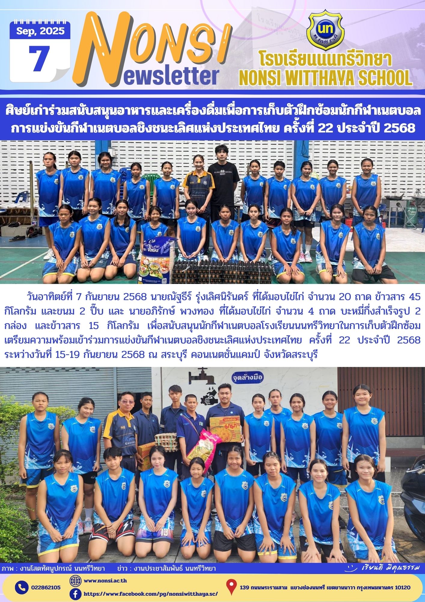 วันอาทิตย์ที่ 7 กันยายน 2568 นายณัฐธีร์ รุ่งเลิศนิรันดร์ ที่ได้มอบไข่ไก่ จำนวน 20 ถาด ข้าวสาร 45 กิโลกรัม และขนม 2 ปี๊บ และ นายอภิรักษ์ พวงทอง ที่ได้มอบไข่ไก่ จำนวน 4 ถาด บะหมี่กึ่งสำเร็จรูป 2 กล่อง และข้าวสาร 15 กิโลกรัม เพื่อสนับสนุนนักกีฬาเนตบอลโรงเรียนนนทรีวิทยาในการเก็บตัวฝึกซ้อม เตรียมความพร้อมเข้าร่วมการแข่งขันกีฬาเนตบอลชิงชนะเลิศแห่งประเทศไทย ครั้งที่ 22 ประจำปี 2568 ระหว่างวันที่ 15-19 กันยายน 2568 ณ สระบุรี คอนเนตชั่นแคมป์ จังหวัดสระบุรี