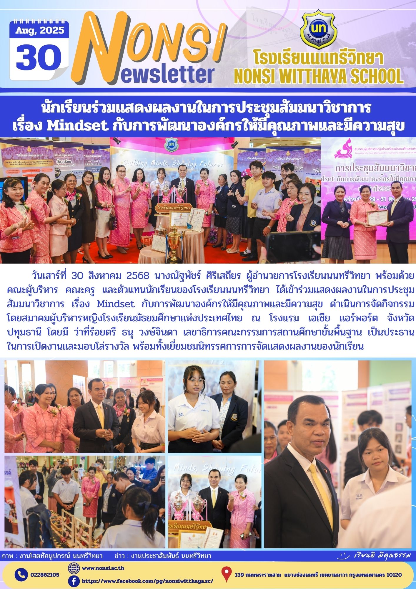 วันเสาร์ที่ 30 สิงหาคม 2568 นางณัฐพัชร์ ศิริเสถียร ผู้อำนวยการโรงเรียนนนทรีวิทยา พร้อมด้วยคณะผู้บริหาร คณะครู และตัวแทนนักเรียนของโรงเรียนนนทรีวิทยา ได้เข้าร่วมแสดงผลงานในการประชุมสัมมนาวิชาการ เรื่อง Mindset กับการพัฒนาองค์กรให้มีคุณภาพและมีความสุข ดำเนินการจัดกิจกรรมโดยสมาคมผู้บริหารหญิงโรงเรียนมัธยมศึกษาแห่งประเทศไทย ณ โรงแรม เอเชีย แอร์พอร์ต จังหวัดปทุมธานี โดยมี ว่าที่ร้อยตรี ธนุ วงษ์จินดา เลขาธิการคณะกรรมการสถานศึกษาขั้นพื้นฐาน เป็นประธาน ในการเปิดงานและมอบโล่รางวัล พร้อมทั้งเยี่ยมชมนิทรรศการการจัดแสดงผลงานของนักเรียน