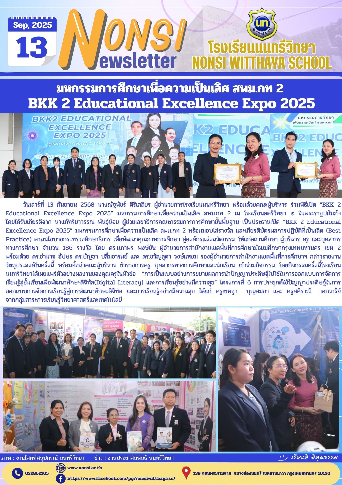 วันเสาร์ที่ 13 กันยายน 2568 นางณัฐพัชร์ ศิริเสถียร ผู้อำนวยการโรงเรียนนนทรีวิทยา พร้อมด้วยคณะผู้บริหาร ร่วมพิธีเปิด “BKK 2 Educational Excellence Expo 2025” มหกรรมการศึกษาเพื่อความเป็นเลิศ สพม.กท 2 ณ โรงเรียนสตรีวิทยา ๒ ในพระราชูปถัมภ์ฯ โดยได้รับเกียรติจาก นางภัทริยาวรรณ พันธุ์น้อย ผู้ช่วยเลขาธิการคณะกรรมการการศึกษาขั้นพื้นฐาน เป็นประธานเปิด “BKK 2 Educational Excellence Expo 2025” มหกรรมการศึกษาเพื่อความเป็นเลิศ สพม.กท 2 พร้อมมอบโล่รางวัล และเกียรติบัตรผลการปฏิบัติที่เป็นเลิศ (Best Practice) ตามนโยบายกระทรวงศึกษาธิการ เพื่อพัฒนาคุณภาพการศึกษา สู่องค์กรแห่งนวัตกรรม ให้แก่สถานศึกษา ผู้บริหาร ครู และบุคลากรทางการศึกษา จำนวน 186 รางวัล โดย ดร.นภาพร พงษ์ขัน ผู้อำนวยการสำนักงานเขตพื้นที่การศึกษามัธยมศึกษากรุงเทพมหานคร เขต 2 พร้อมด้วย ดร.อำนาจ อัปษร ดร.บัญชา ปลื้มอารมย์ และ ดร.ขวัญสุดา วงษ์แหยม รองผู้อำนวยการสำนักงานเขตพื้นที่การศึกษาฯ กล่าวรายงานวัตถุประสงค์ในครั้งนี้ พร้อมทั้งนำคณะผู้บริหาร ข้าราชการครู บุคลากรทางการศึกษาและนักเรียน เข้าร่วมกิจกรรม โดยกิจกรรมครั้งนี้โรงเรียนนนทรีวิทยาได้เผยแพร่ตัวอย่างผลงานของคุณครูในหัวข้อ “การเป็นแบบอย่างการขยายผลการนำปัญญาประดิษฐ์ไปใช้ในการออกแบบการจัดการเรียนรู้สู่ชั้นเรียนเพื่อพัฒนาทักษะดิจิทัล(Digital Literacy) และการเรียนรู้อย่างมีความสุข” โครงการที่ 6 การประยุกต์ใช้ปัญญาประดิษฐ์ในการออกแบบการจัดการเรียนรู้สู่การพัฒนาทักษะดิจิทัล และการเรียนรู้อย่างมีความสุข ได้แก่ ครูเชษฐา บุญสมยา และ ครูศศิราณี เอกวารีย์ จากกลุ่มสาระการเรียนรู้วิทยาศาสตร์และเทคโนโลยี