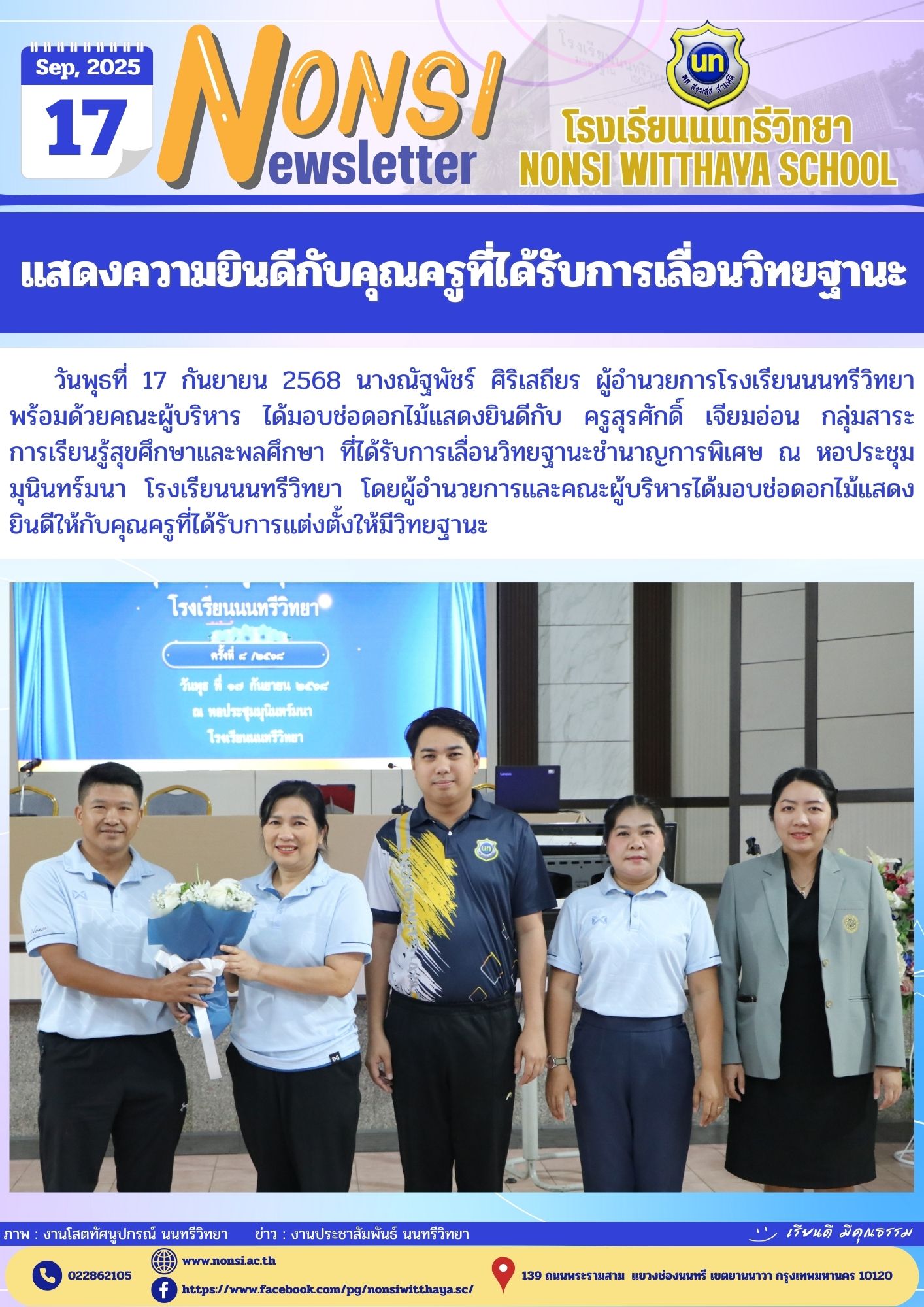 วันพุธที่ 17 กันยายน 2568 นางณัฐพัชร์ ศิริเสถียร ผู้อำนวยการโรงเรียนนนทรีวิทยา พร้อมด้วยคณะผู้บริหาร ได้มอบช่อดอกไม้แสดงยินดีกับ ครูสุรศักดิ์ เจียมอ่อน กลุ่มสาระ การเรียนรู้สุขศึกษาและพลศึกษา ที่ได้รับการเลื่อนวิทยฐานะชำนาญการพิเศษ ณ หอประชุม มุนินทร์มนา โรงเรียนนนทรีวิทยา โดยผู้อำนวยการและคณะผู้บริหารได้มอบช่อดอกไม้แสดงยินดีให้กับคุณครูที่ได้รับการแต่งตั้งให้มีวิทยฐานะ