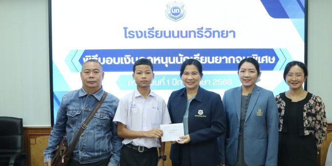 วันพฤหัสบดีที่ 18 กันยายน 2568 นางณัฐพัชร์ ศิริเสถียร ผู้อำนวยการโรงเรียนนนทรีวิทยา ได้มอบหมายให้กลุ่มบริหารงบประมาณ นำโดย นางสาวนันท์นภัส จำปารัตน์ รองผู้อำนวยการโรงเรียนนนทรีวิทยา ได้จัดพิธีมอบทุนอุดหนุนนักเรียนยากจนพิเศษแบบมีเงื่อนไข (นักเรียนทุนเสมอภาค) ซึ่งได้รับการจัดสรรจากกองทุนเพื่อความเสมอภาคทางการศึกษา (กสศ.) ประจำปีการศึกษา 2568 ณ ห้องประชุมอดิสร ใสสุก โดยมี นางณัฐพัชร์ ศิริเสถียร ผู้อำนวยการโรงเรียนนนทรีวิทยา ได้เป็นประธานในพิธีมอบทุนการศึกษา ให้นักเรียนจำนวนทั้งสิ้น 66 คน ทุนละ 1,920 บาท โดยมีตัวแทนนักเรียนและผู้ปกครองเข้าร่วมพิธีมอบทุน โดยมีวัตถุประสงค์เพื่อเป็นการสนับสนุนให้นักเรียนได้มีทุนทรัพย์ใช้ในการศึกษาต่อไป