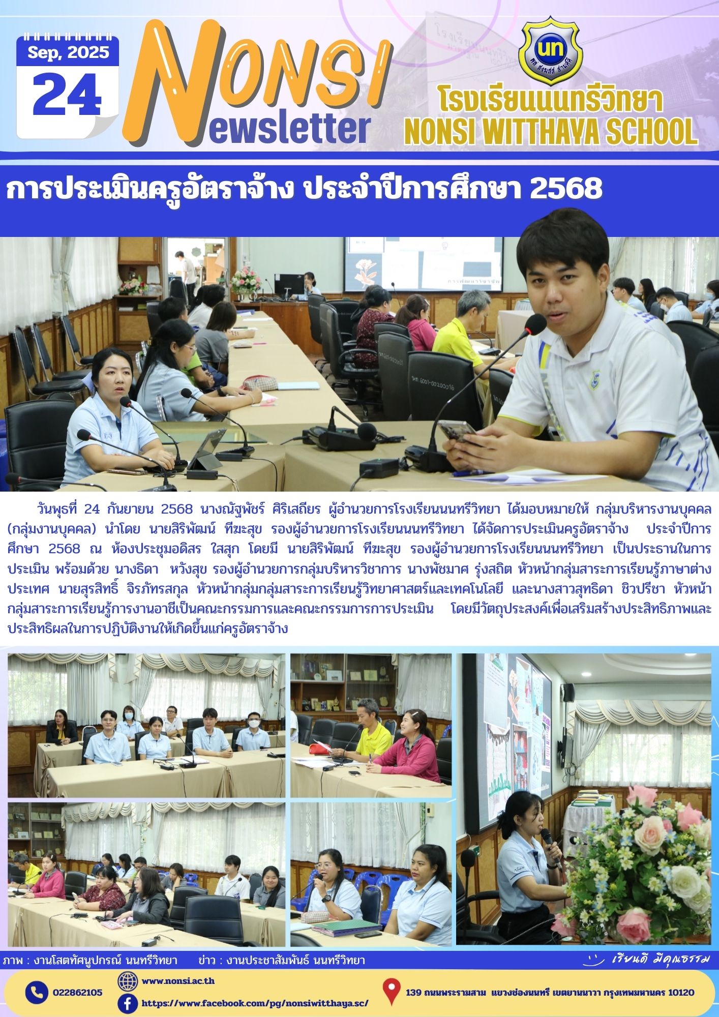 วันพุธที่ 24 กันยายน 2568 นางณัฐพัชร์ ศิริเสถียร ผู้อำนวยการโรงเรียนนนทรีวิทยา ได้มอบหมายให้ กลุ่มบริหารงานบุคคล (กลุ่มงานบุคคล) นำโดย นายสิริพัฒน์ ทีฆะสุข รองผู้อำนวยการโรงเรียนนนทรีวิทยา ได้จัดการประเมินครูอัตราจ้าง ประจำปีการศึกษา 2568 ณ ห้องประชุมอดิสร ใสสุก โดยมี นายสิริพัฒน์ ทีฆะสุข รองผู้อำนวยการโรงเรียนนนทรีวิทยา เป็นประธานในการประเมิน พร้อมด้วย นางธิดา หวังสุข รองผู้อำนวยการกลุ่มบริหารวิชาการ นางพัชมาศ รุ่งสถิต หัวหน้ากลุ่มสาระการเรียนรู้ภาษาต่างประเทศ นายสุรสิทธิ์ จิรภัทรสกุล หัวหน้ากลุ่มกลุ่มสาระการเรียนรู้วิทยาศาสตร์และเทคโนโลยี และนางสาวสุทธิดา ชิวปรีชา หัวหน้ากลุ่มสาระการเรียนรู้การงานอาชีเป็นคณะกรรมการและคณะกรรมการการประเมิน โดยมีวัตถุประสงค์เพื่อเสริมสร้างประสิทธิภาพและประสิทธิผลในการปฏิบัติงานให้เกิดขึ้นแก่ครูอัตราจ้าง