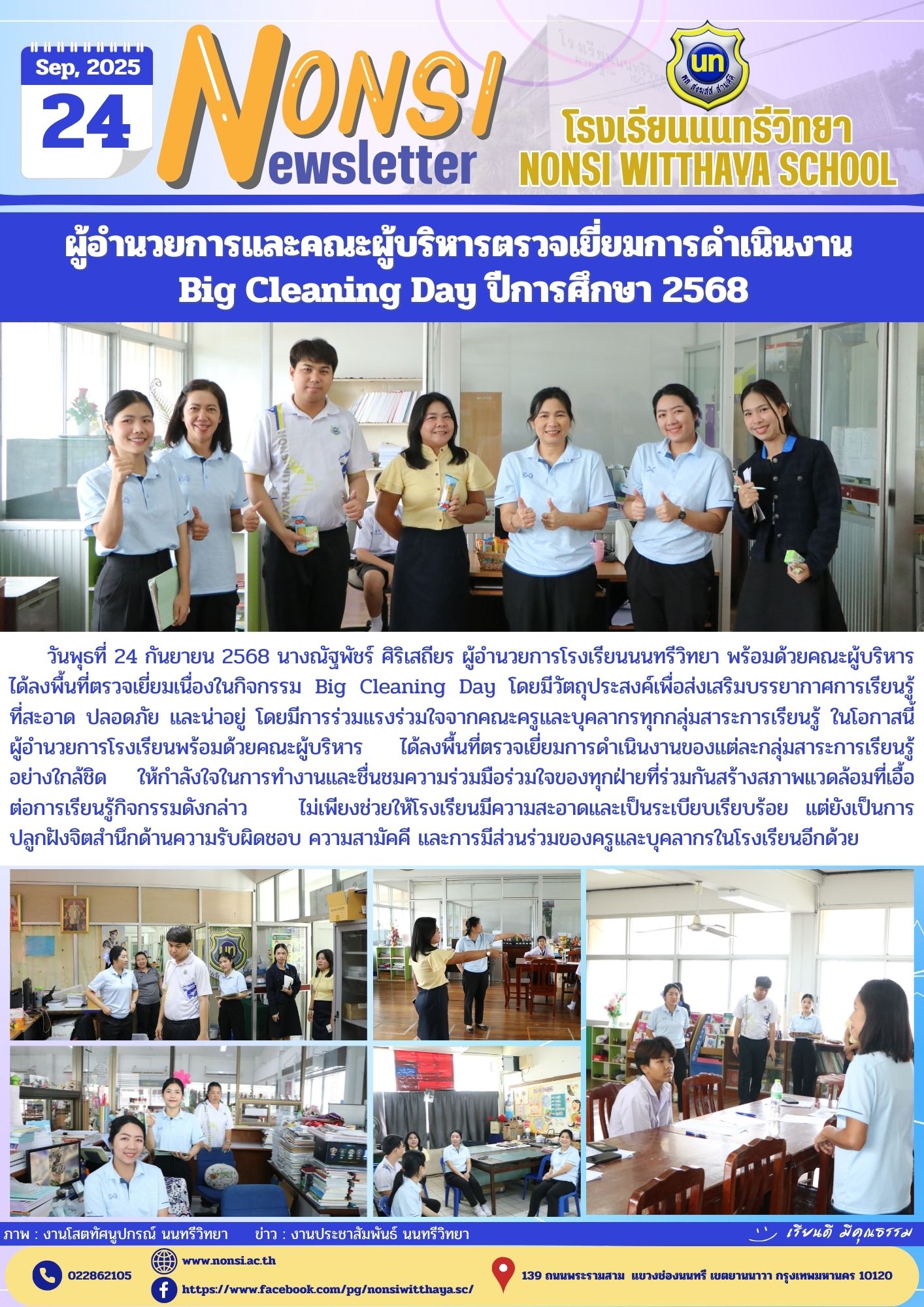 วันพุธที่ 24 กันยายน 2568 นางณัฐพัชร์ ศิริเสถียร ผู้อำนวยการโรงเรียนนนทรีวิทยา พร้อมด้วยคณะผู้บริหาร ได้ลงพื้นที่ตรวจเยี่ยมเนื่องในกิจกรรม Big Cleaning Day โดยมีวัตถุประสงค์เพื่อส่งเสริมบรรยากาศการเรียนรู้ที่สะอาด ปลอดภัย และน่าอยู่ โดยมีการร่วมแรงร่วมใจจากคณะครูและบุคลากรทุกกลุ่มสาระการเรียนรู้ ในโอกาสนี้ ผู้อำนวยการโรงเรียนพร้อมด้วยคณะผู้บริหาร ได้ลงพื้นที่ตรวจเยี่ยมการดำเนินงานของแต่ละกลุ่มสาระการเรียนรู้อย่างใกล้ชิด ให้กำลังใจในการทำงานและชื่นชมความร่วมมือร่วมใจของทุกฝ่ายที่ร่วมกันสร้างสภาพแวดล้อมที่เอื้อต่อการเรียนรู้กิจกรรมดังกล่าวไม่เพียงช่วยให้โรงเรียนมีความสะอาดและเป็นระเบียบเรียบร้อย แต่ยังเป็นการ ปลูกฝังจิตสำนึกด้านความรับผิดชอบ ความสามัคคี และการมีส่วนร่วมของครูและบุคลากรในโรงเรียนอีกด้วย
