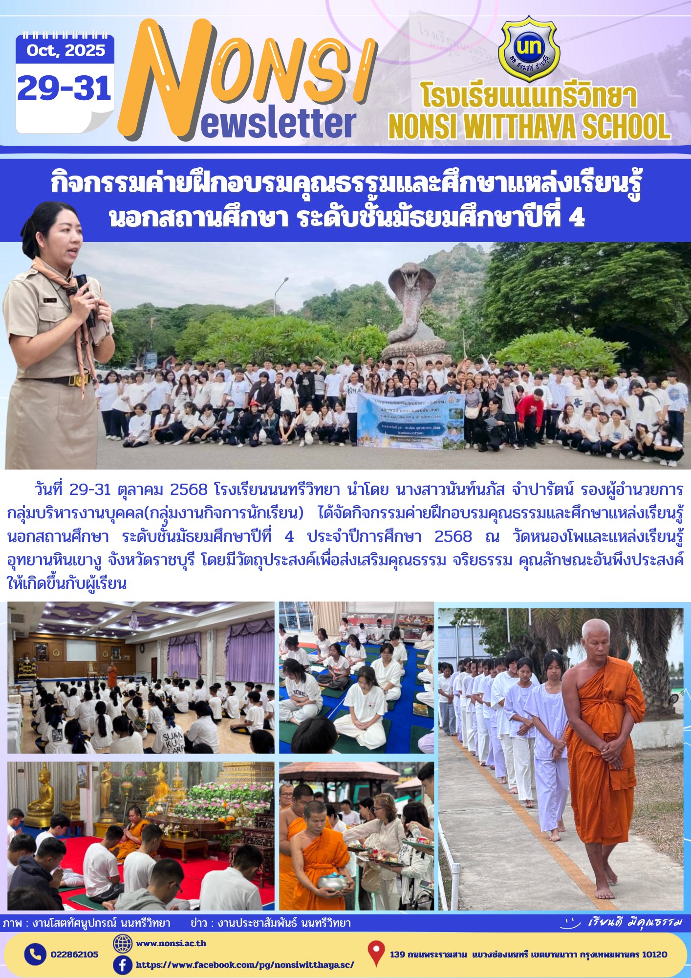 วันที่ 29-31 ตุลาคม 2568 โรงเรียนนนทรีวิทยา นำโดย นางสาวนันท์นภัส จำปารัตน์ รองผู้อำนวยการกลุ่มบริหารงานบุคคล(กลุ่มงานกิจการนักเรียน) ได้จัดกิจกรรมค่ายฝึกอบรมคุณธรรมและศึกษาแหล่งเรียนรู้นอกสถานศึกษา ระดับชั้นมัธยมศึกษาปีที่ 4 ประจำปีการศึกษา 2568 ณ วัดหนองโพและแหล่งเรียนรู้ อุทยานหินเขางู จังหวัดราชบุรี โดยมีวัตถุประสงค์เพื่อส่งเสริมคุณธรรม จริยธรรม คุณลักษณะอันพึงประสงค์ให้เกิดขึ้นกับผู้เรียน