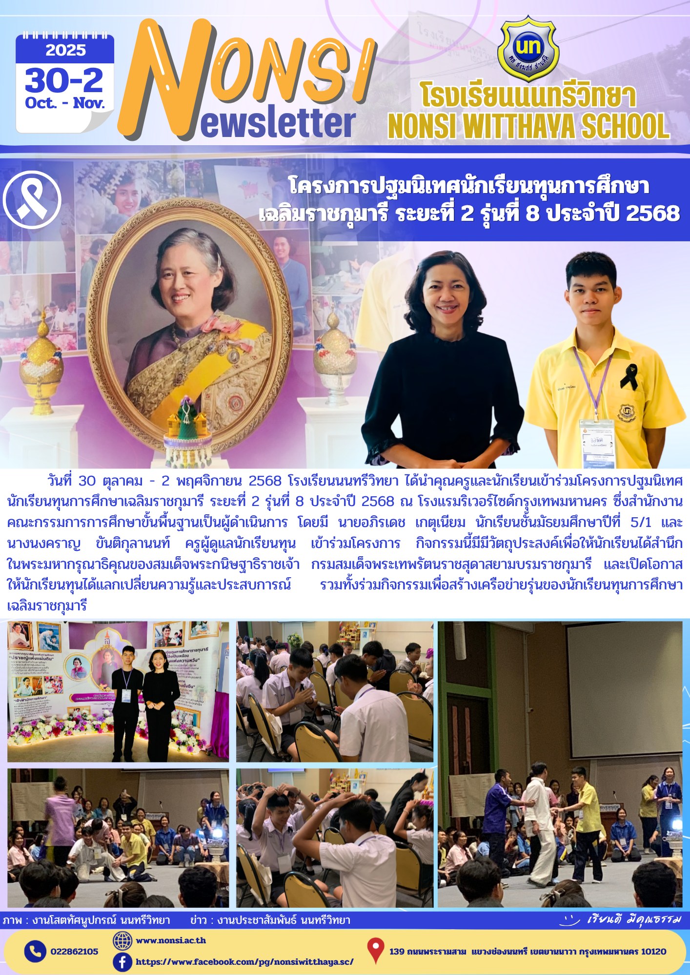 วันที่ 30 ตุลาคม – 2 พฤศจิกายน 2568 โรงเรียนนนทรีวิทยา ได้นำคุณครูและนักเรียนเข้าร่วมโครงการปฐมนิเทศนักเรียนทุนการศึกษาเฉลิมราชกุมารี ระยะที่ 2 รุ่นที่ 8 ประจำปี 2568 ณ โรงแรมริเวอร์ไซด์กรุงเทพมหานคร ซึ่งสำนักงานคณะกรรมการการศึกษาขั้นพื้นฐานเป็นผู้ดำเนินการ โดยมี นายอภิรเดช เกตุเนียม นักเรียนชั้นมัธยมศึกษาปีที่ 5/1 และ นางนงคราญ ขันติกุลานนท์ ครูผู้ดูแลนักเรียนทุน เข้าร่วมโครงการ กิจกรรมนี้มีมีวัตถุประสงค์เพื่อให้นักเรียนได้สำนึกในพระมหากรุณาธิคุณของสมเด็จพระกนิษฐาธิราชเจ้า กรมสมเด็จพระเทพรัตนราชสุดาสยามบรมราชกุมารี และเปิดโอกาสให้นักเรียนทุนได้แลกเปลี่ยนความรู้และประสบการณ์ รวมทั้งร่วมกิจกรรมเพื่อสร้างเครือข่ายรุ่นของนักเรียนทุนการศึกษาเฉลิมราชกุมารี