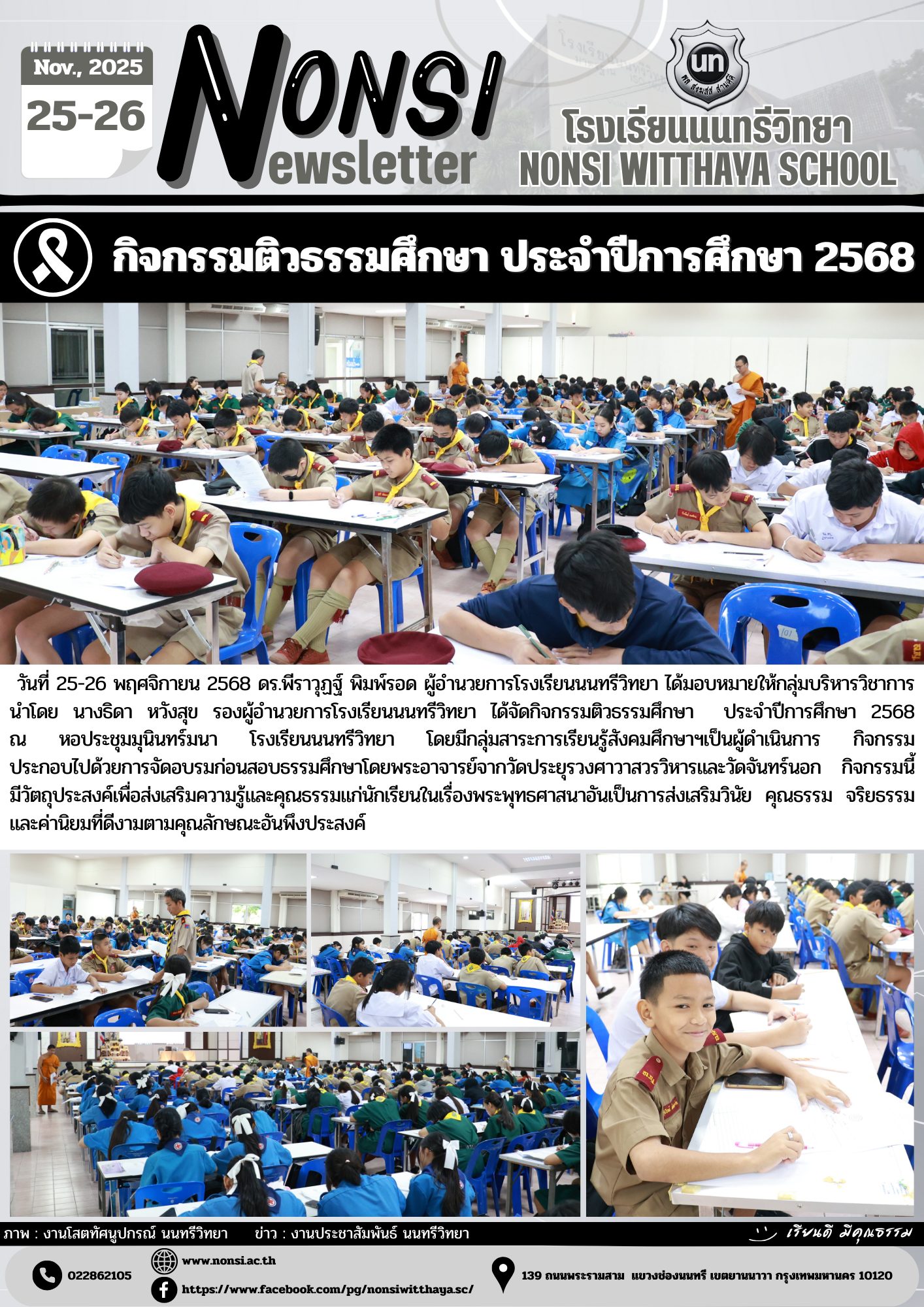 วันที่ 25-26 พฤศจิกายน 2568 ดร.พีราวุฏฐ์ พิมพ์รอด ผู้อำนวยการโรงเรียนนนทรีวิทยา ได้มอบหมายให้กลุ่มบริหารวิชาการ นำโดย นางธิดา หวังสุข รองผู้อำนวยการโรงเรียนนนทรีวิทยา ได้จัดกิจกรรมติวธรรมศึกษา ประจำปีการศึกษา 2568 ณ หอประชุมมุนินทร์มนา โรงเรียนนนทรีวิทยา โดยมีกลุ่มสาระการเรียนรู้สังคมศึกษาฯเป็นผู้ดำเนินการ กิจกรรมประกอบไปด้วยการจัดอบรมก่อนสอบธรรมศึกษาโดยพระอาจารย์จากวัดประยุรวงศาวาสวรวิหารและวัดจันทร์นอก กิจกรรมนี้มีวัตถุประสงค์เพื่อส่งเสริมความรู้และคุณธรรมแก่นักเรียนในเรื่องพระพุทธศาสนาอันเป็นการส่งเสริมวินัย คุณธรรม จริยธรรมและค่านิยมที่ดีงามตามคุณลักษณะอันพึงประสงค์