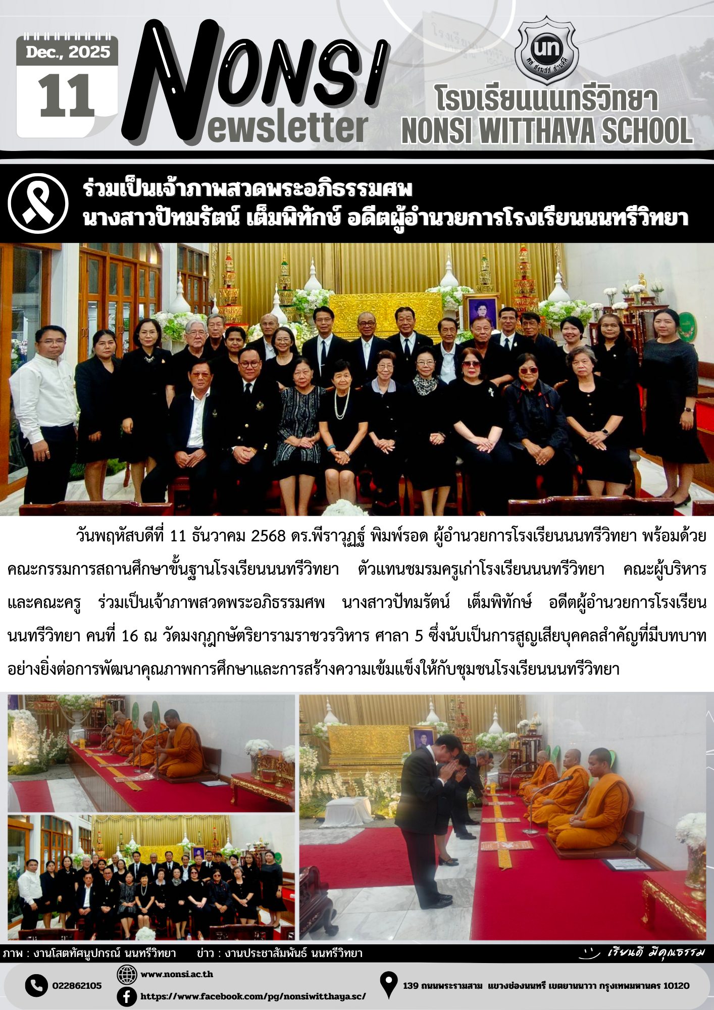 วันพฤหัสบดีที่ 11 ธันวาคม 2568 ดร.พีราวุฏฐ์ พิมพ์รอด ผู้อำนวยการโรงเรียนนนทรีวิทยา พร้อมด้วยคณะกรรมการสถานศึกษาขั้นฐานโรงเรียนนนทรีวิทยา ตัวแทนชมรมครูเก่าโรงเรียนนนทรีวิทยา คณะผู้บริหาร และคณะครู ร่วมเป็นเจ้าภาพสวดพระอภิธรรมศพ นางสาวปัทมรัตน์ เต็มพิทักษ์ อดีตผู้อำนวยการโรงเรียนนนทรีวิทยา คนที่ 16 ณ วัดมงกุฎกษัตริยารามราชวรวิหาร ศาลา 5 ซึ่งนับเป็นการสูญเสียบุคคลสำคัญที่มีบทบาทอย่างยิ่งต่อการพัฒนาคุณภาพการศึกษาและการสร้างความเข้มแข็งให้กับชุมชนโรงเรียนนนทรีวิทยา