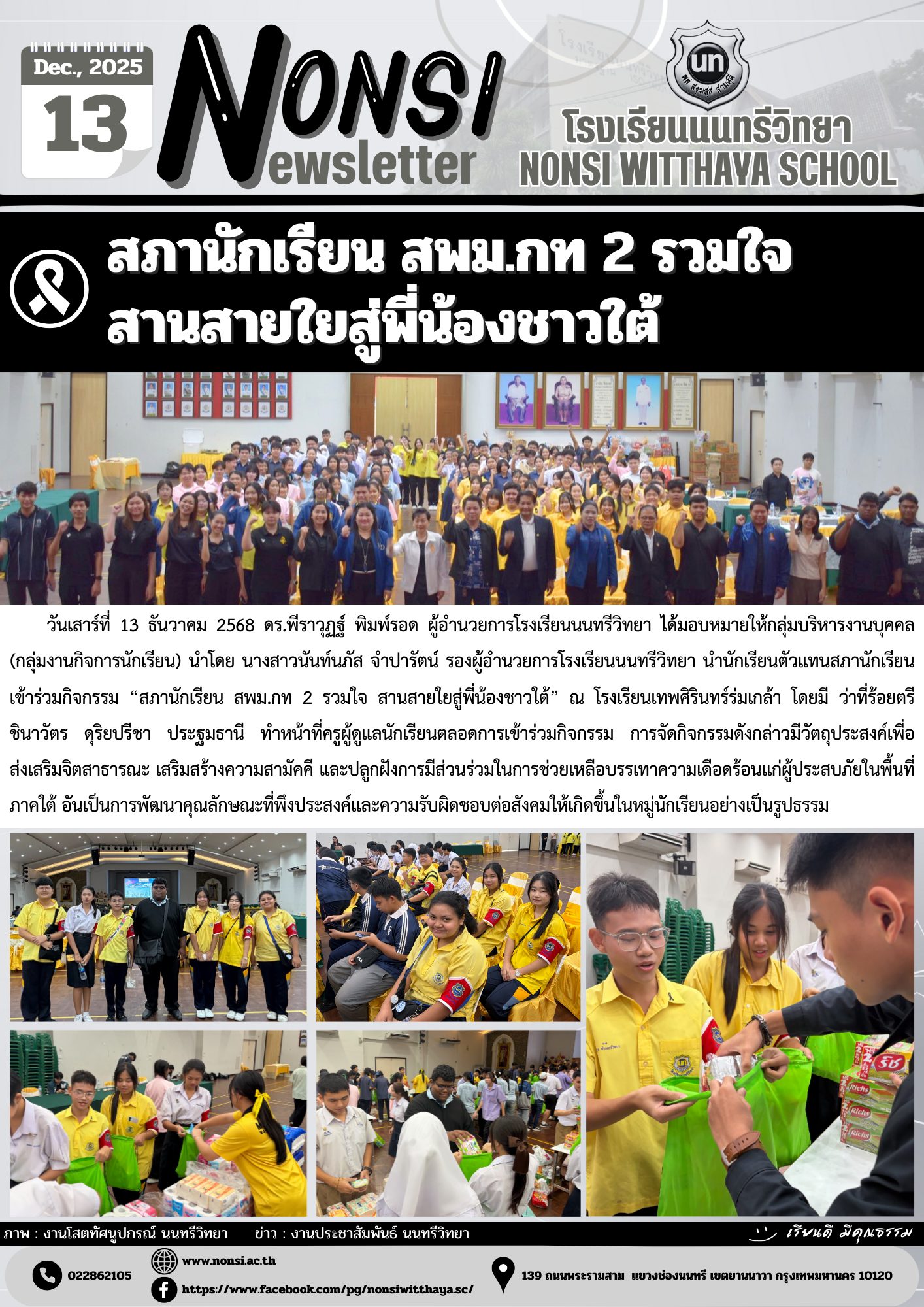 วันเสาร์ที่ 13 ธันวาคม 2568 ดร.พีราวุฏฐ์ พิมพ์รอด ผู้อำนวยการโรงเรียนนนทรีวิทยา ได้มอบหมายให้กลุ่มบริหารงานบุคคล (กลุ่มงานกิจการนักเรียน) นำโดย นางสาวนันท์นภัส จำปารัตน์ รองผู้อำนวยการโรงเรียนนนทรีวิทยา นำนักเรียนตัวแทนสภานักเรียน เข้าร่วมกิจกรรม “สภานักเรียน สพม.กท 2 รวมใจ สานสายใยสู่พี่น้องชาวใต้” ณ โรงเรียนเทพศิรินทร์ร่มเกล้า โดยมี ว่าที่ร้อยตรี ชินาวัตร ดุริยปรีชา ประฐมธานี ทำหน้าที่ครูผู้ดูแลนักเรียนตลอดการเข้าร่วมกิจกรรม การจัดกิจกรรมดังกล่าวมีวัตถุประสงค์เพื่อส่งเสริมจิตสาธารณะ เสริมสร้างความสามัคคี และปลูกฝังการมีส่วนร่วมในการช่วยเหลือบรรเทาความเดือดร้อนแก่ผู้ประสบภัยในพื้นที่ภาคใต้ อันเป็นการพัฒนาคุณลักษณะที่พึงประสงค์และความรับผิดชอบต่อสังคมให้เกิดขึ้นในหมู่นักเรียนอย่างเป็นรูปธรรม