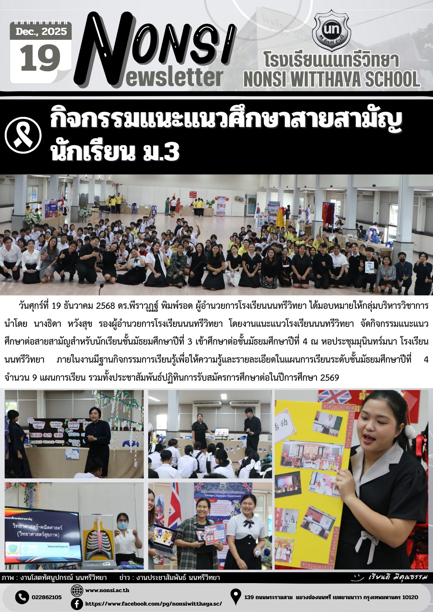 วันศุกร์ที่ 19 ธันวาคม 2568 ดร.พีราวุฏฐ์ พิมพ์รอด ผู้อำนวยการโรงเรียนนนทรีวิทยา ได้มอบหมายให้กลุ่มบริหารวิชาการ นำโดย นางธิดา หวังสุข รองผู้อำนวยการโรงเรียนนนทรีวิทยา โดยงานแนะแนวโรงเรียนนนทรีวิทยา จัดกิจกรรมแนะแนวศึกษาต่อสายสามัญสำหรับนักเรียนชั้นมัธยมศึกษาปีที่ 3 เข้าศึกษาต่อชั้นมัธยมศึกษาปีที่ 4 ณ หอประชุมมุนินทร์มนา โรงเรียนนนทรีวิทยา ภายในงานมีฐานกิจกรรมการเรียนรู้เพื่อให้ความรู้และรายละเอียดในแผนการเรียนระดับชั้นมัธยมศึกษาปีที่ 4 จำนวน 9 แผนการเรียน รวมทั้งประชาสัมพันธ์ปฏิทินการรับสมัครการศึกษาต่อในปีการศึกษา 2569