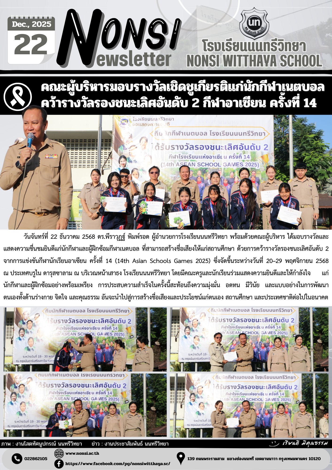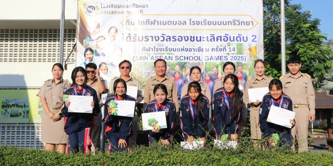 วันจันทร์ที่ 22 ธันวาคม 2568 ดร.พีราวุฏฐ์ พิมพ์รอด ผู้อำนวยการโรงเรียนนนทรีวิทยา พร้อมด้วยคณะผู้บริหาร ได้มอบรางวัลและแสดงความชื่นชมยินดีแก่นักกีฬาและผู้ฝึกซ้อมกีฬาเนตบอล ที่สามารถสร้างชื่อเสียงให้แก่สถานศึกษา ด้วยการคว้ารางวัลรองชนะเลิศอันดับ 2 จากการแข่งขันกีฬานักเรียนอาเซียน ครั้งที่ 14 (14th Asian Schools Games 2025) ซึ่งจัดขึ้นระหว่างวันที่ 20–29 พฤศจิกายน 2568 ณ ประเทศบรูไน ดารุสซาลาม ณ บริเวณหน้าเสาธง โรงเรียนนนทรีวิทยา โดยมีคณะครูและนักเรียนร่วมแสดงความยินดีและให้กำลังใจแก่นักกีฬาและผู้ฝึกซ้อมอย่างพร้อมเพรียง การประสบความสำเร็จในครั้งนี้สะท้อนถึงความมุ่งมั่น อดทน มีวินัย และแบบอย่างในการพัฒนาตนเองทั้งด้านร่างกาย จิตใจ และคุณธรรม อันจะนำไปสู่การสร้างชื่อเสียงและประโยชน์แก่ตนเอง สถานศึกษา และประเทศชาติต่อไปในอนาคต