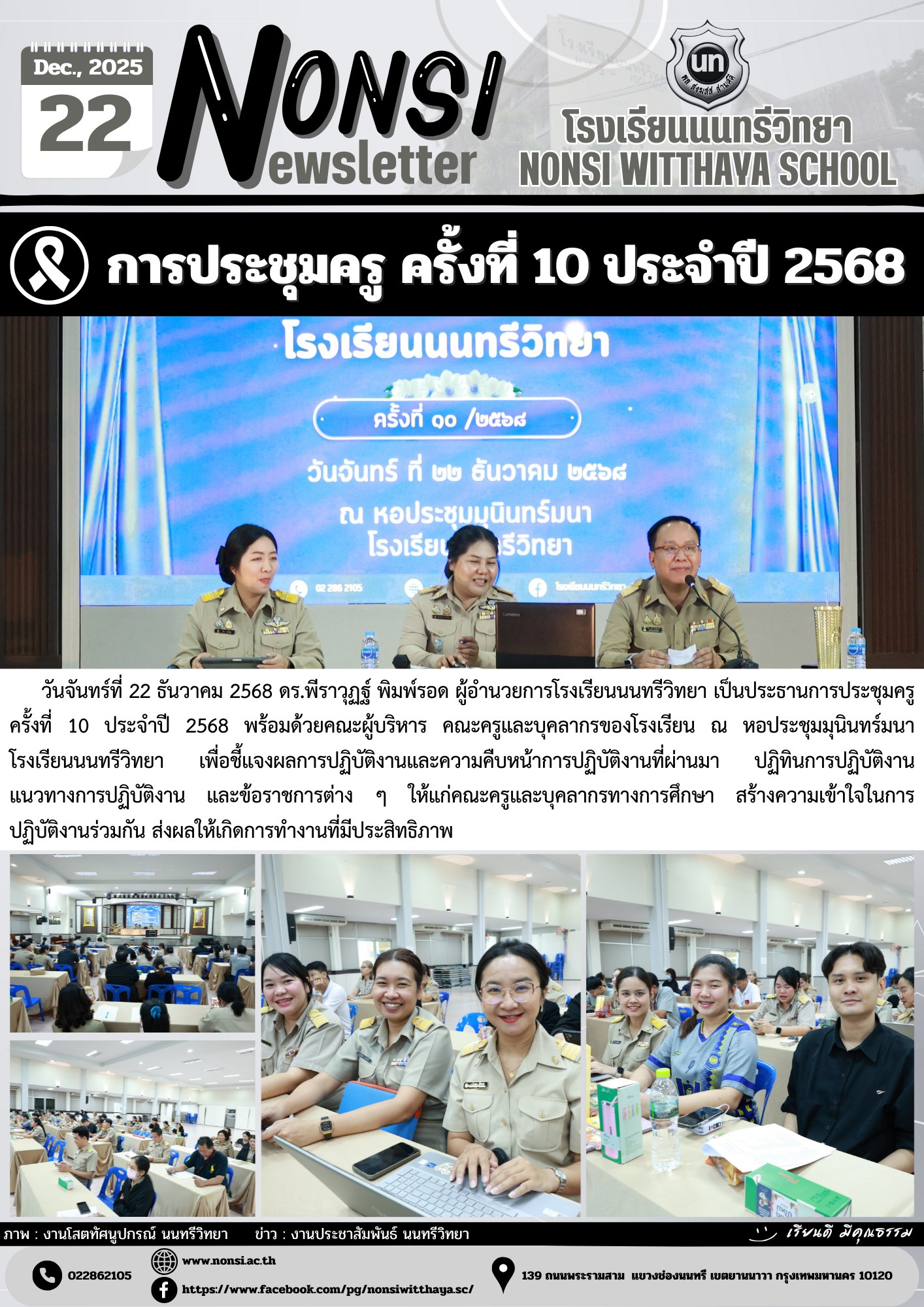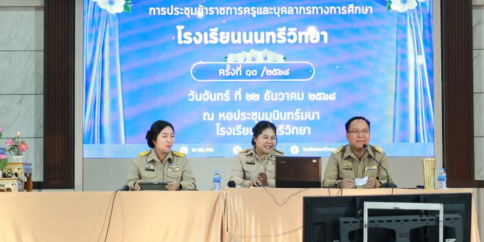 วันจันทร์ที่ 22 ธันวาคม 2568 ดร.พีราวุฏฐ์ พิมพ์รอด ผู้อำนวยการโรงเรียนนนทรีวิทยา เป็นประธานการประชุมครูครั้งที่ 10 ประจำปี 2568 พร้อมด้วยคณะผู้บริหาร คณะครูและบุคลากรของโรงเรียน ณ หอประชุมมุนินทร์มนา โรงเรียนนนทรีวิทยา เพื่อชี้แจงผลการปฏิบัติงานและความคืบหน้าการปฏิบัติงานที่ผ่านมา ปฏิทินการปฏิบัติงาน แนวทางการปฏิบัติงาน และข้อราชการต่าง ๆ ให้แก่คณะครูและบุคลากรทางการศึกษา สร้างความเข้าใจในการปฏิบัติงานร่วมกัน ส่งผลให้เกิดการทำงานที่มีประสิทธิภาพ