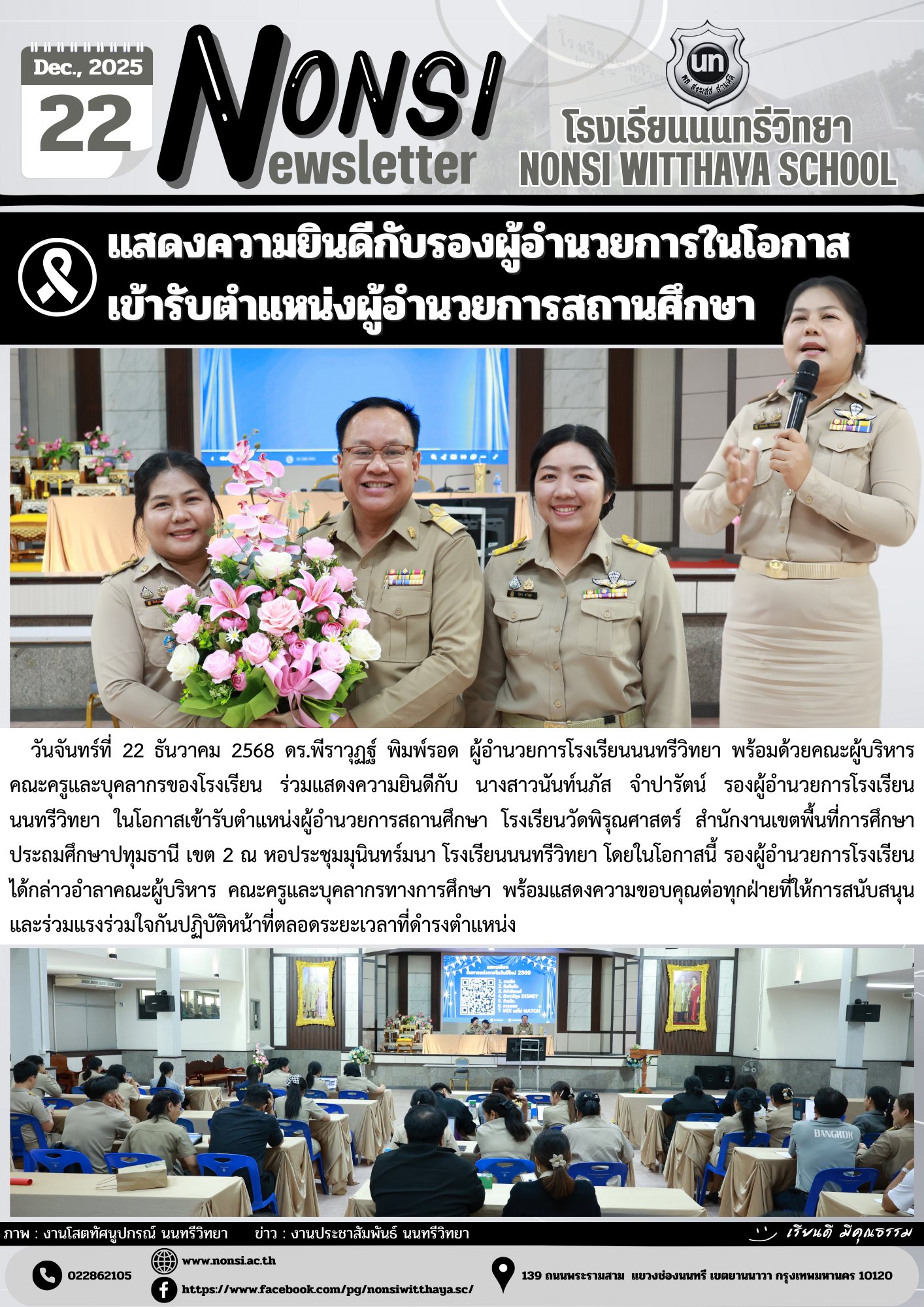 วันจันทร์ที่ 22 ธันวาคม 2568 ดร.พีราวุฏฐ์ พิมพ์รอด ผู้อำนวยการโรงเรียนนนทรีวิทยา พร้อมด้วยคณะผู้บริหาร คณะครูและบุคลากรของโรงเรียน ร่วมแสดงความยินดีกับ นางสาวนันท์นภัส จำปารัตน์ รองผู้อำนวยการโรงเรียนนนทรีวิทยา ในโอกาสเข้ารับตำแหน่งผู้อำนวยการสถานศึกษา โรงเรียนวัดพิรุณศาสตร์ สำนักงานเขตพื้นที่การศึกษาประถมศึกษาปทุมธานี เขต 2 ณ หอประชุมมุนินทร์มนา โรงเรียนนนทรีวิทยา โดยในโอกาสนี้ รองผู้อำนวยการโรงเรียนได้กล่าวอำลาคณะผู้บริหาร คณะครูและบุคลากรทางการศึกษา พร้อมแสดงความขอบคุณต่อทุกฝ่ายที่ให้การสนับสนุนและร่วมแรงร่วมใจกันปฏิบัติหน้าที่ตลอดระยะเวลาที่ดำรงตำแหน่ง