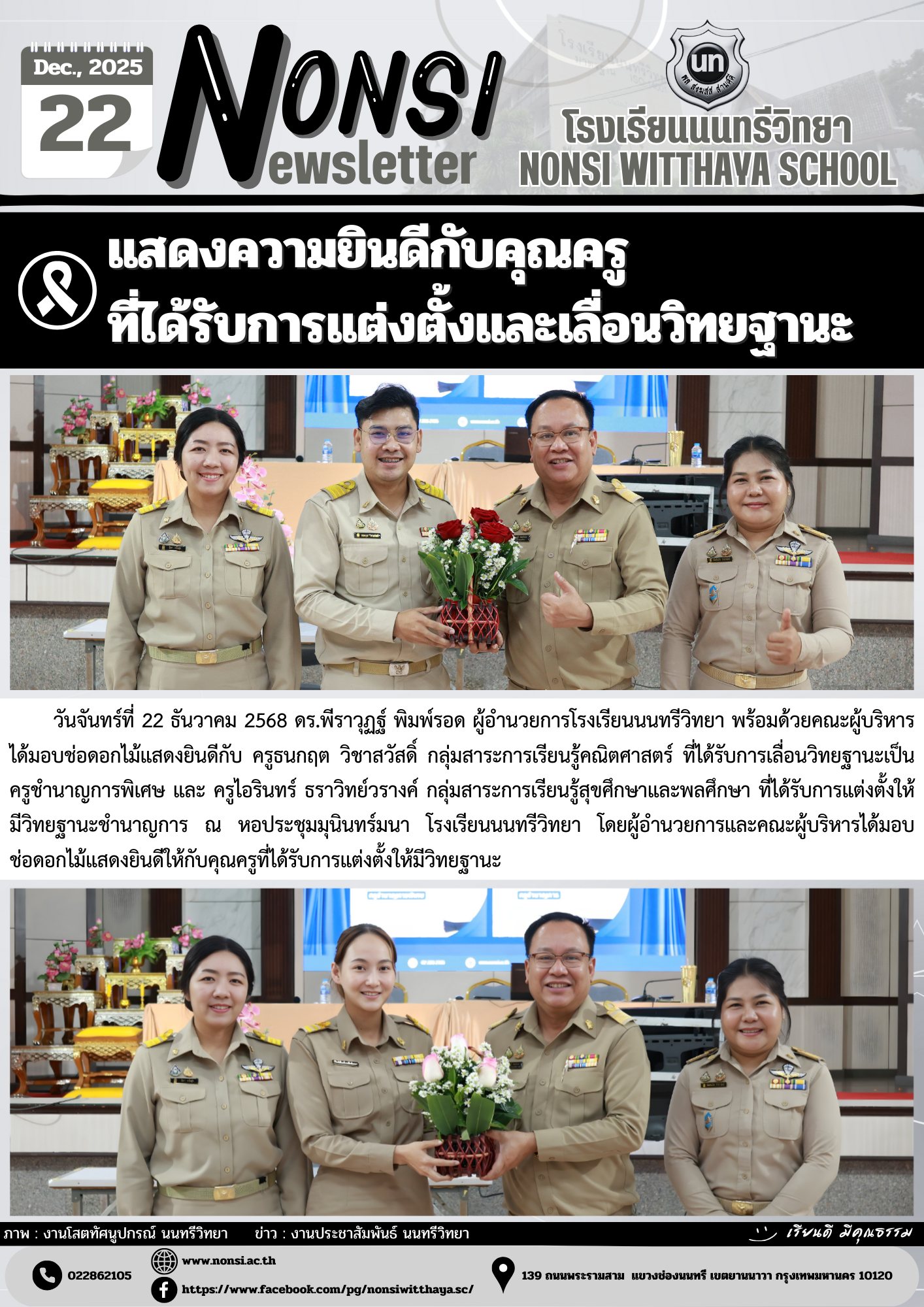 วันจันทร์ที่ 22 ธันวาคม 2568 ดร.พีราวุฏฐ์ พิมพ์รอด ผู้อำนวยการโรงเรียนนนทรีวิทยา พร้อมด้วยคณะผู้บริหาร ได้มอบช่อดอกไม้แสดงยินดีกับ ครูธนกฤต วิชาสวัสดิ์ กลุ่มสาระการเรียนรู้คณิตศาสตร์ ที่ได้รับการเลื่อนวิทยฐานะเป็นครูชำนาญการพิเศษ และ ครูไอรินทร์ ธราวิทย์วรางค์ กลุ่มสาระการเรียนรู้สุขศึกษาและพลศึกษา ที่ได้รับการแต่งตั้งให้มีวิทยฐานะชำนาญการ ณ หอประชุมมุนินทร์มนา โรงเรียนนนทรีวิทยา โดยผู้อำนวยการและคณะผู้บริหารได้มอบช่อดอกไม้แสดงยินดีให้กับคุณครูที่ได้รับการแต่งตั้งให้มีวิทยฐานะ