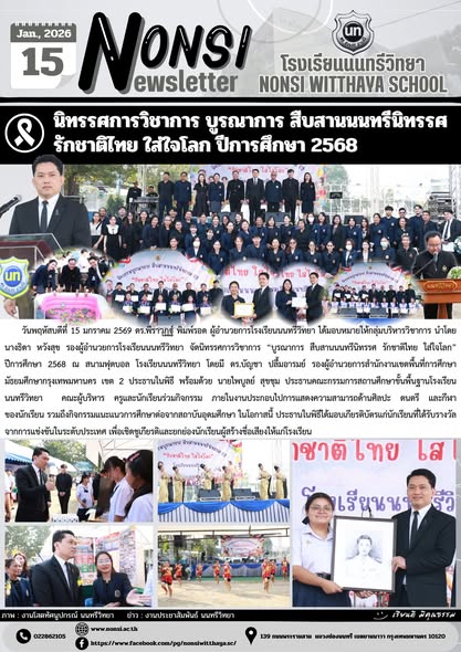 วันพฤหัสบดีที่ 15 มกราคม 2569 ดร.พีราวุฏฐ์ พิมพ์รอด ผู้อำนวยการโรงเรียนนนทรีวิทยา ได้มอบหมายให้กลุ่มบริหารวิชาการ นำโดย นางธิดา หวังสุข รองผู้อำนวยการโรงเรียนนนทรีวิทยา จัดนิทรรศการวิชาการ “บูรณาการ สืบสานนนทรีนิทรรศ รักชาติไทย ใส่ใจโลก” ปีการศึกษา 2568 ณ สนามฟุตบอล โรงเรียนนนทรีวิทยา โดยมี ดร.บัญชา ปลื้มอารมย์ รองผู้อำนวยการสำนักงานเขตพื้นที่การศึกษามัธยมศึกษากรุงเทพมหานคร เขต 2 ประธานในพิธี พร้อมด้วย นายไพบูลย์ สุขชุม ประธานคณะกรรมการสถานศึกษาขั้นพื้นฐานโรงเรียนนนทรีวิทยา คณะผู้บริหาร ครูและนักเรียนร่วมกิจกรรม ภายในงานประกอบไปการแสดงความสามารถด้านศิลปะ ดนตรี และกีฬาของนักเรียน รวมถึงกิจกรรมแนะแนวการศึกษาต่อจากสถาบันอุดมศึกษา ในโอกาสนี้ ประธานในพิธีได้มอบเกียรติบัตรแก่นักเรียนที่ได้รับรางวัลจากการแข่งขันในระดับประเทศ เพื่อเชิดชูเกียรติและยกย่องนักเรียนผู้สร้างชื่อเสียงให้แก่โรงเรียน