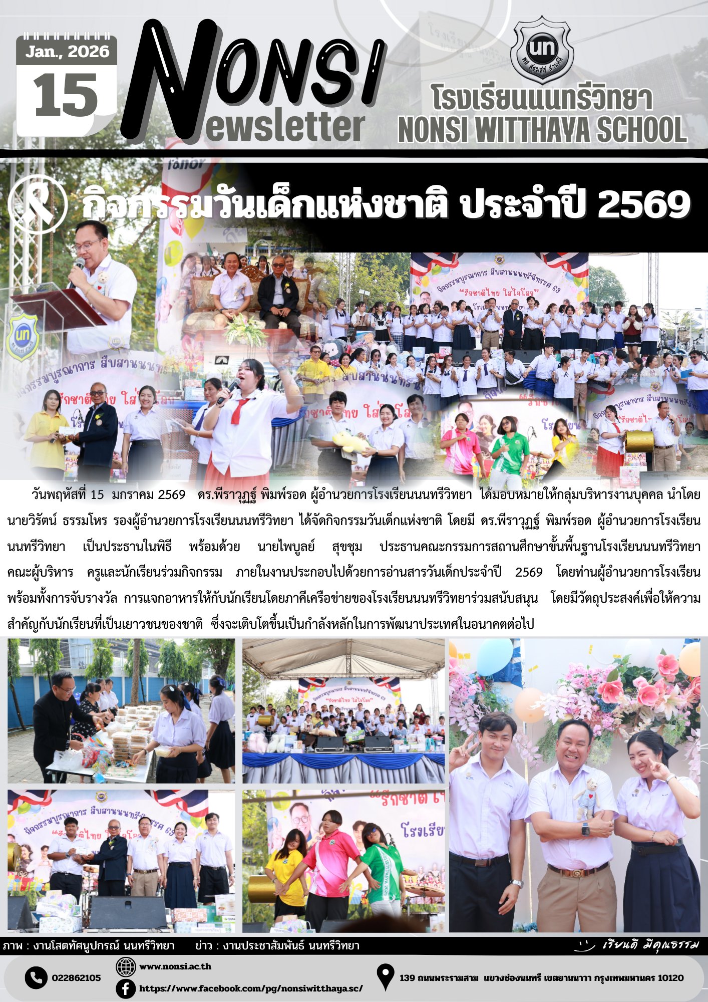 วันพฤหัสที่ 15 มกราคม 2569 ดร.พีราวุฏฐ์ พิมพ์รอด ผู้อำนวยการโรงเรียนนนทรีวิทยา ได้มอบหมายให้กลุ่มบริหารงานบุคคล นำโดย นายวิรัตน์ ธรรมโหร รองผู้อำนวยการโรงเรียนนนทรีวิทยา ได้จัดกิจกรรมวันเด็กแห่งชาติ โดยมี ดร.พีราวุฏฐ์ พิมพ์รอด ผู้อำนวยการโรงเรียนนนทรีวิทยา เป็นประธานในพิธี พร้อมด้วย นายไพบูลย์ สุขชุม ประธานคณะกรรมการสถานศึกษาขั้นพื้นฐานโรงเรียนนนทรีวิทยา คณะผู้บริหาร ครูและนักเรียนร่วมกิจกรรม ภายในงานประกอบไปด้วยการอ่านสารวันเด็กประจำปี 2569 โดยท่านผู้อำนวยการโรงเรียน พร้อมทั้งการจับรางวัล การแจกอาหารให้กับนักเรียนโดยภาคีเครือข่ายของโรงเรียนนนทรีวิทยาร่วมสนับสนุน โดยมีวัตถุประสงค์เพื่อให้ความสำคัญกับนักเรียนที่เป็นเยาวชนของชาติ ซึ่งจะเติบโตขึ้นเป็นกำลังหลักในการพัฒนาประเทศในอนาคตต่อไป