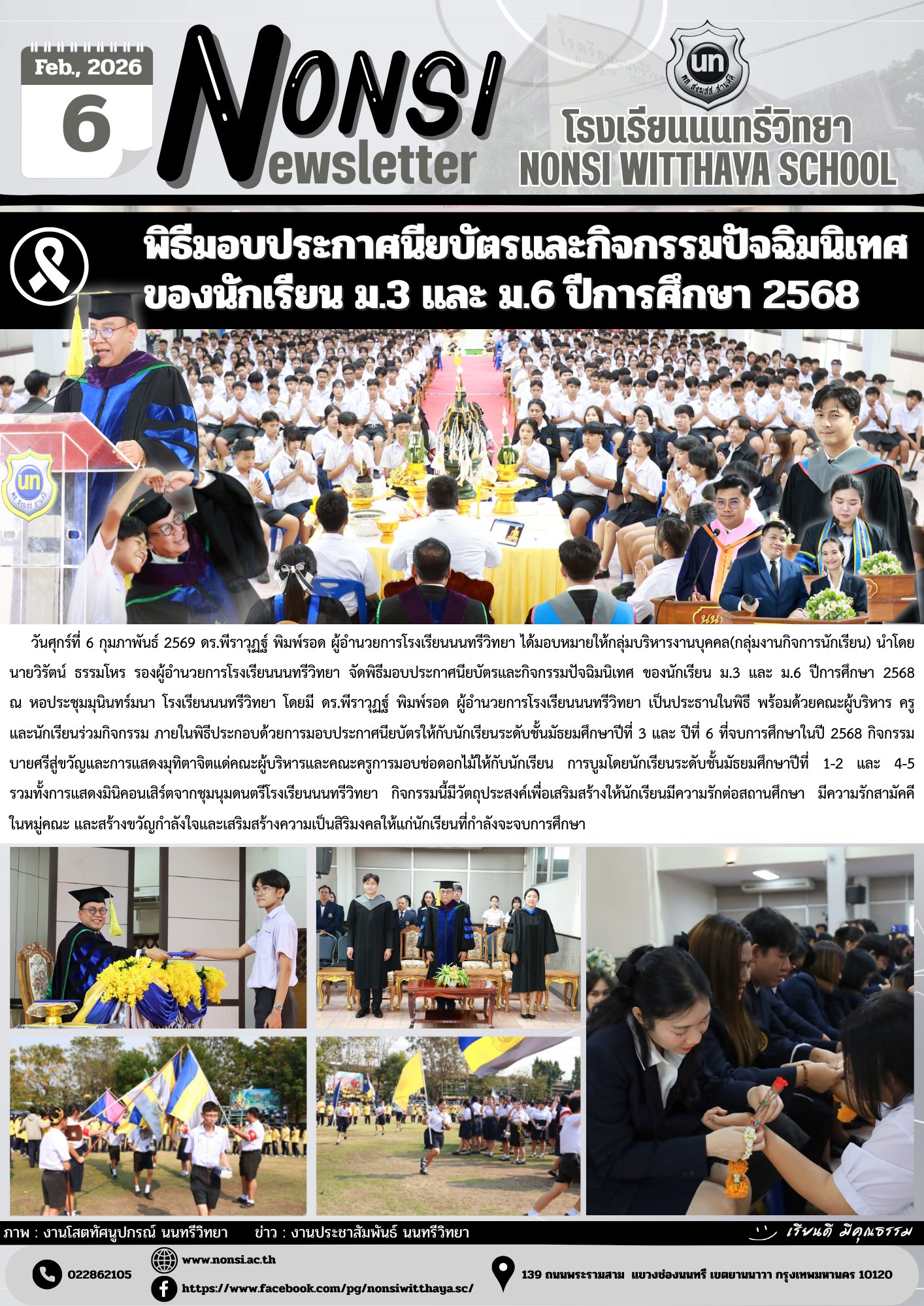 วันศุกร์ที่ 6 กุมภาพันธ์ 2569 ดร.พีราวุฏฐ์ พิมพ์รอด ผู้อำนวยการโรงเรียนนนทรีวิทยา ได้มอบหมายให้กลุ่มบริหารงานบุคคล(กลุ่มงานกิจการนักเรียน) นำโดยนายวิรัตน์ ธรรมโหร รองผู้อำนวยการโรงเรียนนนทรีวิทยา จัดพิธีมอบประกาศนียบัตรและกิจกรรมปัจฉิมนิเทศ ของนักเรียน ม.3 และ ม.6 ปีการศึกษา 2568 ณ หอประชุมมุนินทร์มนา โรงเรียนนนทรีวิทยา โดยมี ดร.พีราวุฏฐ์ พิมพ์รอด ผู้อำนวยการโรงเรียนนนทรีวิทยา เป็นประธานในพิธี พร้อมด้วยคณะผู้บริหาร ครู และนักเรียนร่วมกิจกรรม ภายในพิธีประกอบด้วยการมอบประกาศนียบัตรให้กับนักเรียนระดับชั้นมัธยมศึกษาปีที่ 3 และ ปีที่ 6 ที่จบการศึกษาในปี 2568 กิจกรรมบายศรีสู่ขวัญและการแสดงมุทิตาจิตแด่คณะผู้บริหารและคณะครูการมอบช่อดอกไม้ให้กับนักเรียน การบูมโดยนักเรียนระดับชั้นมัธยมศึกษาปีที่ 1-2 และ 4-5 รวมทั้งการแสดงมินิคอนเสิร์ตจากชุมนุมดนตรีโรงเรียนนนทรีวิทยา กิจกรรมนี้มีวัตถุประสงค์เพื่อเสริมสร้างให้นักเรียนมีความรักต่อสถานศึกษา มีความรักสามัคคี ในหมู่คณะ และสร้างขวัญกำลังใจและเสริมสร้างความเป็นสิริมงคลให้แก่นักเรียนที่กำลังจะจบการศึกษา