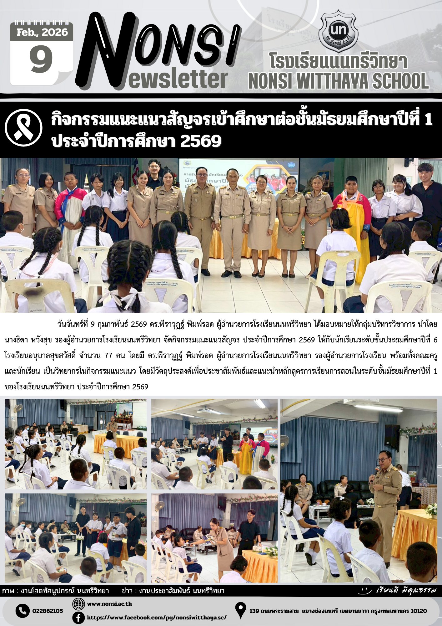 วันจันทร์ที่ 9 กุมภาพันธ์ 2569 ดร.พีราวุฏฐ์ พิมพ์รอด ผู้อำนวยการโรงเรียนนนทรีวิทยา ได้มอบหมายให้กลุ่มบริหารวิชาการ นำโดย นางธิดา หวังสุข รองผู้อำนวยการโรงเรียนนนทรีวิทยา จัดกิจกรรมแนะแนวสัญจร ประจำปีการศึกษา 2569 ให้กับนักเรียนระดับชั้นประถมศึกษาปีที่ 6 โรงเรียนอนุบาลสุขสวัสดิ์ จำนวน 77 คน โดยมี ดร.พีราวุฏฐ์ พิมพ์รอด ผู้อำนวยการโรงเรียนนนทรีวิทยา รองผู้อำนวยการโรงเรียน พร้อมทั้งคณะครูและนักเรียน เป็นวิทยากรในกิจกรรมแนะแนว โดยมีวัตถุประสงค์เพื่อประชาสัมพันธ์และแนะนำหลักสูตรการเรียนการสอนในระดับชั้นมัธยมศึกษาปีที่ 1 ของโรงเรียนนนทรีวิทยา ประจำปีการศึกษา 2569