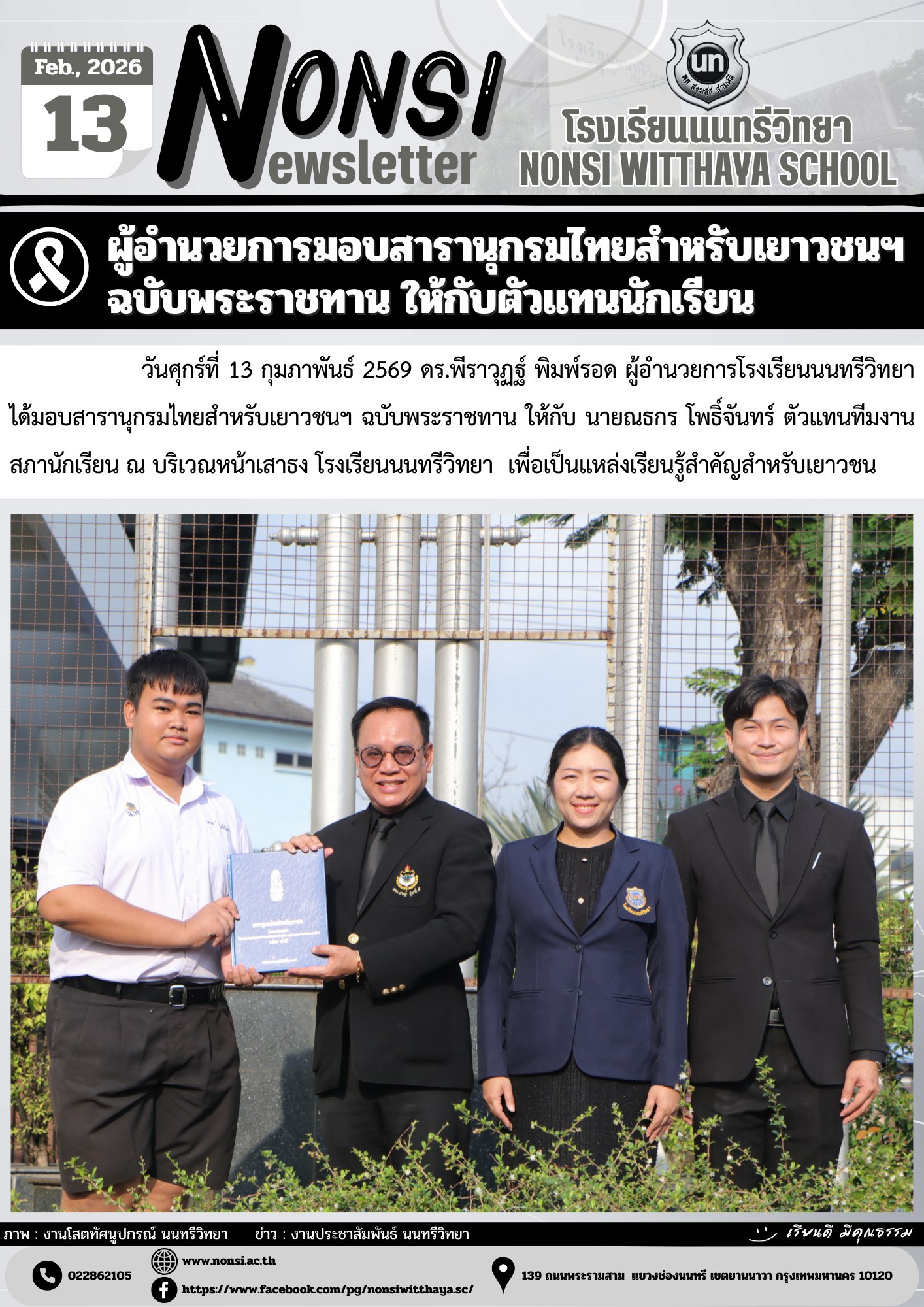 วันศุกร์ที่ 13 กุมภาพันธ์ 2569 ดร.พีราวุฏฐ์ พิมพ์รอด ผู้อำนวยการโรงเรียนนนทรีวิทยา ได้มอบสารานุกรมไทยสำหรับเยาวชนฯ ฉบับพระราชทาน ให้กับ นายณธกร โพธิ์จันทร์ ตัวแทนทีมงานสภานักเรียน ณ บริเวณหน้าเสาธง โรงเรียนนนทรีวิทยา เพื่อเป็นแหล่งเรียนรู้สำคัญสำหรับเยาวชน