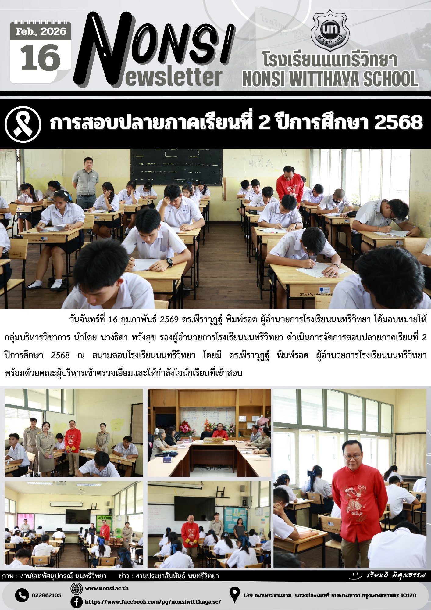 วันจันทร์ที่ 16 กุมภาพันธ์ 2569 ดร.พีราวุฏฐ์ พิมพ์รอด ผู้อำนวยการโรงเรียนนนทรีวิทยา ได้มอบหมายให้กลุ่มบริหารวิชาการ นำโดย นางธิดา หวังสุข รองผู้อำนวยการโรงเรียนนนทรีวิทยา ดำเนินการจัดการสอบปลายภาคเรียนที่ 2 ปีการศึกษา 2568 ณ สนามสอบโรงเรียนนนทรีวิทยา โดยมี ดร.พีราวุฏฐ์ พิมพ์รอด ผู้อำนวยการโรงเรียนนนทรีวิทยา พร้อมด้วยคณะผู้บริหารเข้าตรวจเยี่ยมและให้กำลังใจนักเรียนที่เข้าสอบ