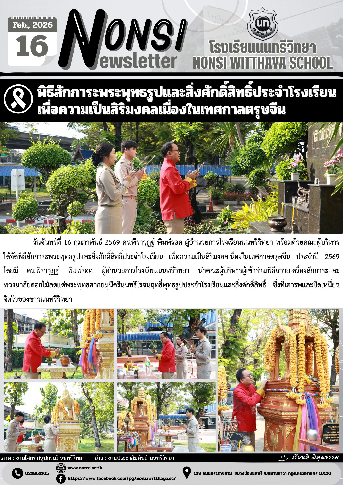 วันจันทร์ที่ 16 กุมภาพันธ์ 2569 ดร.พีราวุฏฐ์ พิมพ์รอด ผู้อำนวยการโรงเรียนนนทรีวิทยา พร้อมด้วยคณะผู้บริหาร ได้จัดพิธีสักการะพระพุทธรูปและสิ่งศักดิ์สิทธิ์ประจำโรงเรียน เพื่อความเป็นสิริมงคลเนื่องในเทศกาลตรุษจีน ประจำปี 2569 โดยมี ดร.พีราวุฏฐ์ พิมพ์รอด ผู้อำนวยการโรงเรียนนนทรีวิทยา นำคณะผู้บริหารผู้เข้าร่วมพิธีถวายเครื่องสักการะและพวงมาลัยดอกไม้สดแด่พระพุทธศากยมุนีศรีนนทรีโรจนฤทธิ์พุทธรูปประจำโรงเรียนและสิ่งศักดิ์สิทธิ์ ซึ่งที่เคารพและยึดเหนี่ยวจิตใจของชาวนนทรีวิทยา