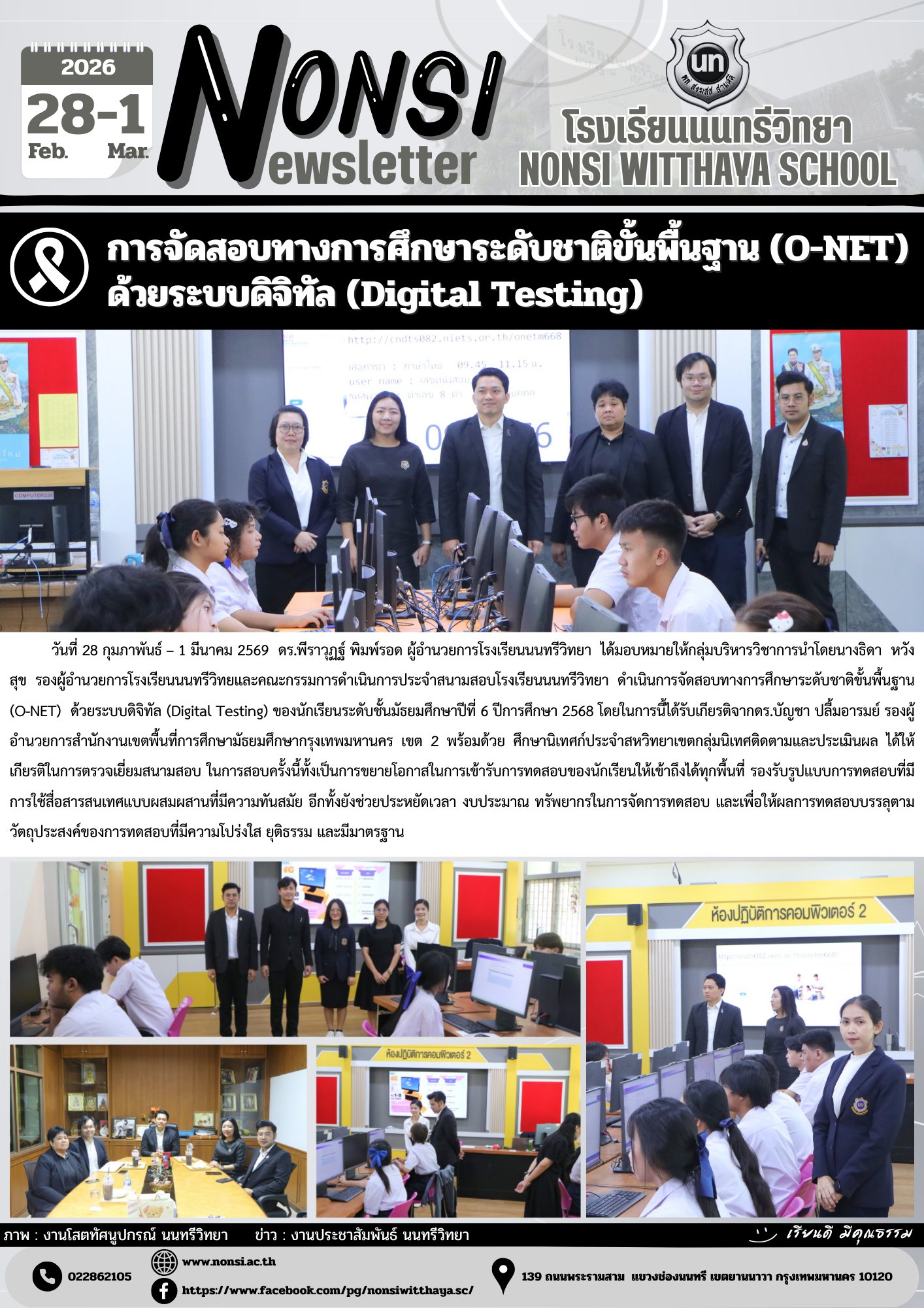 วันที่ 28 กุมภาพันธ์ – 1 มีนาคม 2569 ดร.พีราวุฏฐ์ พิมพ์รอด ผู้อำนวยการโรงเรียนนนทรีวิทยา ได้มอบหมายให้กลุ่มบริหารวิชาการนำโดยนางธิดา หวังสุข รองผู้อำนวยการโรงเรียนนนทรีวิทยและคณะกรรมการดำเนินการประจำสนามสอบโรงเรียนนนทรีวิทยา ดำเนินการจัดสอบทางการศึกษาระดับชาติขั้นพื้นฐาน (O-NET) ด้วยระบบดิจิทัล (Digital Testing) ของนักเรียนระดับชั้นมัธยมศึกษาปีที่ 6 ปีการศึกษา 2568 โดยในการนี้ได้รับเกียรติจากดร.บัญชา ปลื้มอารมย์ รองผู้อำนวยการสำนักงานเขตพื้นที่การศึกษามัธยมศึกษากรุงเทพมหานคร เขต 2 พร้อมด้วย ศึกษานิเทศก์ประจำสหวิทยาเขตกลุ่มนิเทศติดตามและประเมินผล ได้ให้เกียรติในการตรวจเยี่ยมสนามสอบ ในการสอบครั้งนี้ทั้งเป็นการขยายโอกาสในการเข้ารับการทดสอบของนักเรียนให้เข้าถึงได้ทุกพื้นที่ รองรับรูปแบบการทดสอบที่มีการใช้สื่อสารสนเทศแบบผสมผสานที่มีความทันสมัย อีกทั้งยังช่วยประหยัดเวลา งบประมาณ ทรัพยากรในการจัดการทดสอบ และเพื่อให้ผลการทดสอบบรรลุตามวัตถุประสงค์ของการทดสอบที่มีความโปร่งใส ยุติธรรม และมีมาตรฐาน