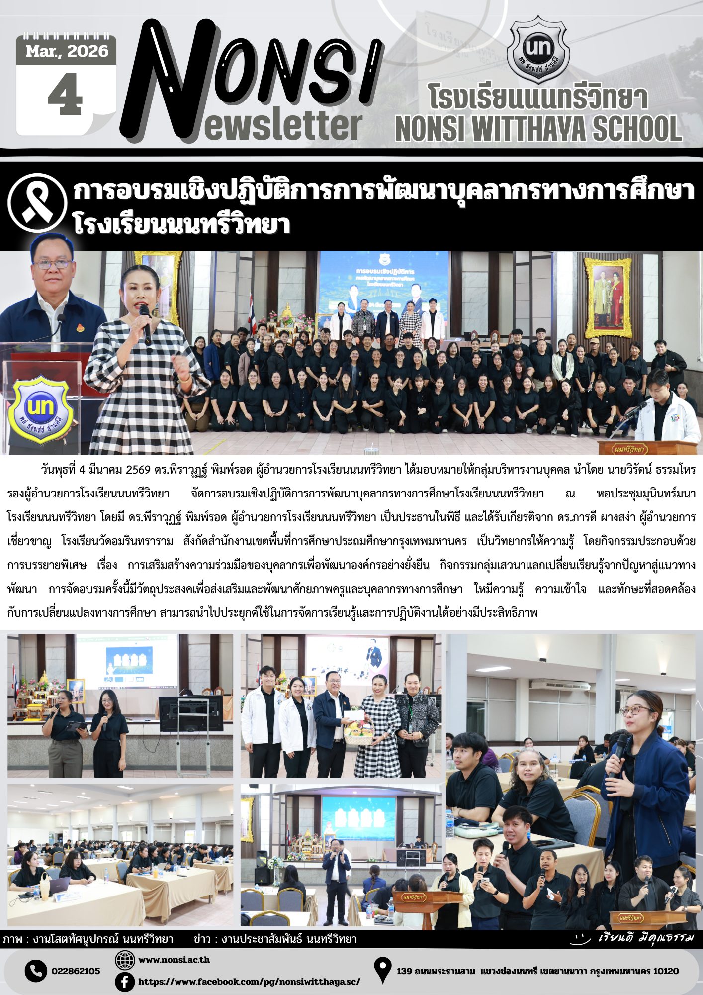 วันพุธที่ 4 มีนาคม 2569 ดร.พีราวุฏฐ์ พิมพ์รอด ผู้อำนวยการโรงเรียนนนทรีวิทยา ได้มอบหมายให้กลุ่มบริหารงานบุคคล นำโดย นายวิรัตน์ ธรรมโหร รองผู้อำนวยการโรงเรียนนนทรีวิทยา จัดการอบรมเชิงปฏิบัติการการพัฒนาบุคลากรทางการศึกษาโรงเรียนนนทรีวิทยา ณ หอประชุมมุนินทร์มนา โรงเรียนนนทรีวิทยา โดยมี ดร.พีราวุฏฐ์ พิมพ์รอด ผู้อำนวยการโรงเรียนนนทรีวิทยา เป็นประธานในพิธี และได้รับเกียรติจาก ดร.ภารดี ผางสง่า ผู้อำนวยการเชี่ยวชาญ โรงเรียนวัดอมรินทราราม สังกัดสำนักงานเขตพื้นที่การศึกษาประถมศึกษากรุงเทพมหานคร เป็นวิทยากรให้ความรู้ โดยกิจกรรมประกอบด้วย การบรรยายพิเศษ เรื่อง การเสริมสร้างความร่วมมือของบุคลากรเพื่อพัฒนาองค์กรอย่างยั่งยืน กิจกรรมกลุ่มเสวนาแลกเปลี่ยนเรียนรู้จากปัญหาสู่แนวทางพัฒนา การจัดอบรมครั้งนี้มีวัตถุประสงคเพื่อส่งเสริมและพัฒนาศักยภาพครูและบุคลากรทางการศึกษา ใหมีความรู้ ความเข้าใจ และทักษะที่สอดคล้องกับการเปลี่ยนแปลงทางการศึกษา สามารถนำไปประยุกต์ใช้ในการจัดการเรียนรู้และการปฏิบัติงานได้อย่างมีประสิทธิภาพ