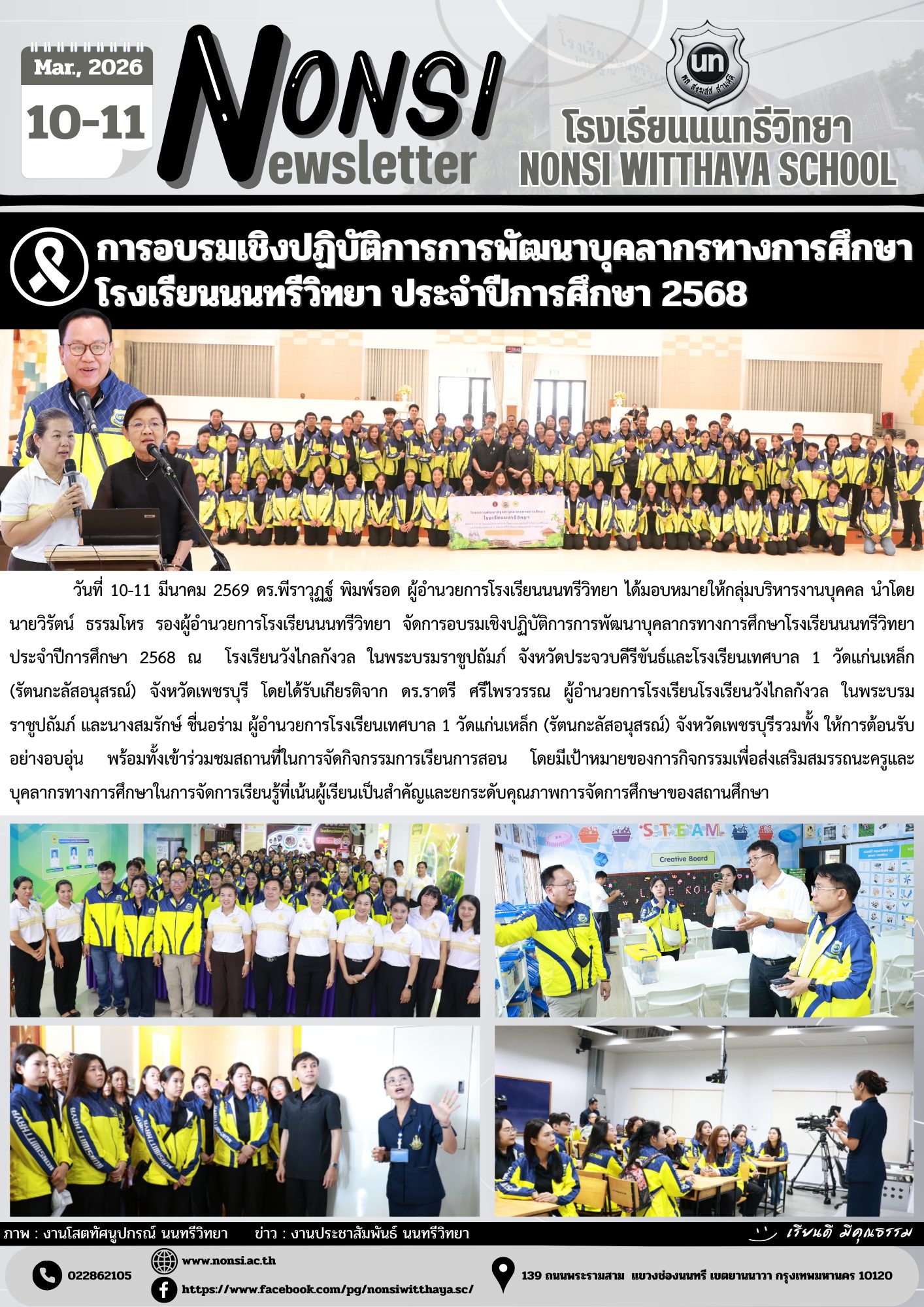 วันที่ 10-11 มีนาคม 2569 ดร.พีราวุฏฐ์ พิมพ์รอด ผู้อำนวยการโรงเรียนนนทรีวิทยา ได้มอบหมายให้กลุ่มบริหารงานบุคคล นำโดย นายวิรัตน์ ธรรมโหร รองผู้อำนวยการโรงเรียนนนทรีวิทยา จัดการอบรมเชิงปฏิบัติการการพัฒนาบุคลากรทางการศึกษาโรงเรียนนนทรีวิทยา ประจำปีการศึกษา 2568 ณ โรงเรียนวังไกลกังวล ในพระบรมราชูปถัมภ์ จังหวัดประจวบคีรีขันธ์และโรงเรียนเทศบาล 1 วัดแก่นเหล็ก (รัตนกะลัสอนุสรณ์) จังหวัดเพชรบุรี โดยได้รับเกียรติจาก ดร.ราตรี ศรีไพรวรรณ ผู้อำนวยการโรงเรียนโรงเรียนวังไกลกังวล ในพระบรมราชูปถัมภ์ และนางสมรักษ์ ชื่นอร่าม ผู้อำนวยการโรงเรียนเทศบาล 1 วัดแก่นเหล็ก (รัตนกะลัสอนุสรณ์) จังหวัดเพชรบุรีรวมทั้ง ให้การต้อนรับอย่างอบอุ่น พร้อมทั้งเข้าร่วมชมสถานที่ในการจัดกิจกรรมการเรียนการสอน โดยมีเป้าหมายของการกิจกรรมเพื่อส่งเสริมสมรรถนะครูและบุคลากรทางการศึกษาในการจัดการเรียนรู้ที่เน้นผู้เรียนเป็นสำคัญและยกระดับคุณภาพการจัดการศึกษาของสถานศึกษา